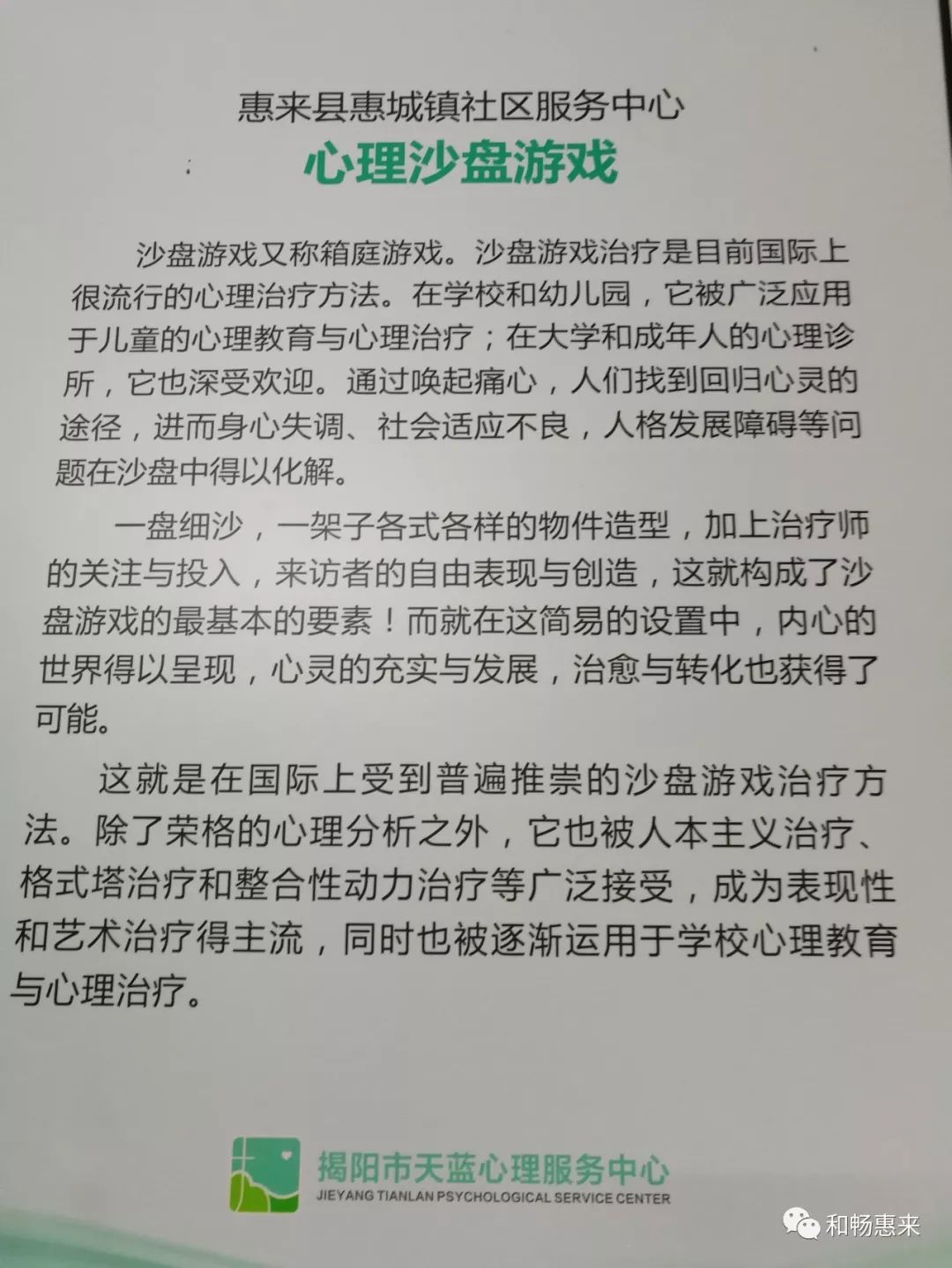 为探索建立科学有效、符合本地实际的社区戒毒康复机制模式,2017年,惠来县投资200多万元建设了惠城镇社区康复综合服务中心,按照“试点创新、模式复制”的思路迅速推进吸毒人员社区戒毒社区康复工作,全面推开全县社区戒毒社区康复工作。通过购买服务的形式,惠来县与市天蓝心理服务中心合作,由该中心承接惠来县惠城镇社区康复综合服务中心项目,采取“心理咨询师+社工+志愿者”服务模式,运用心理治疗技术,帮助社区戒毒康复人员从心理上远离毒品,并运用社会工作的专业方法链接资源,帮助戒毒康复人员回归家庭和社会。