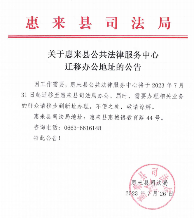关于惠来县公共法律服务中心迁移办公地址的公告