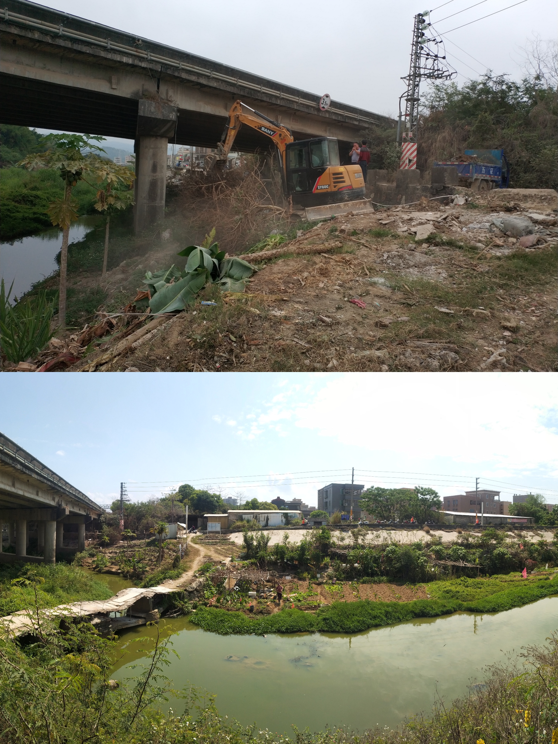 惠来县水利局堤防管理站联合惠城镇政府、惠城镇梅二社区对盐岭河广鸣路段乱搭乱占进行拆除清障