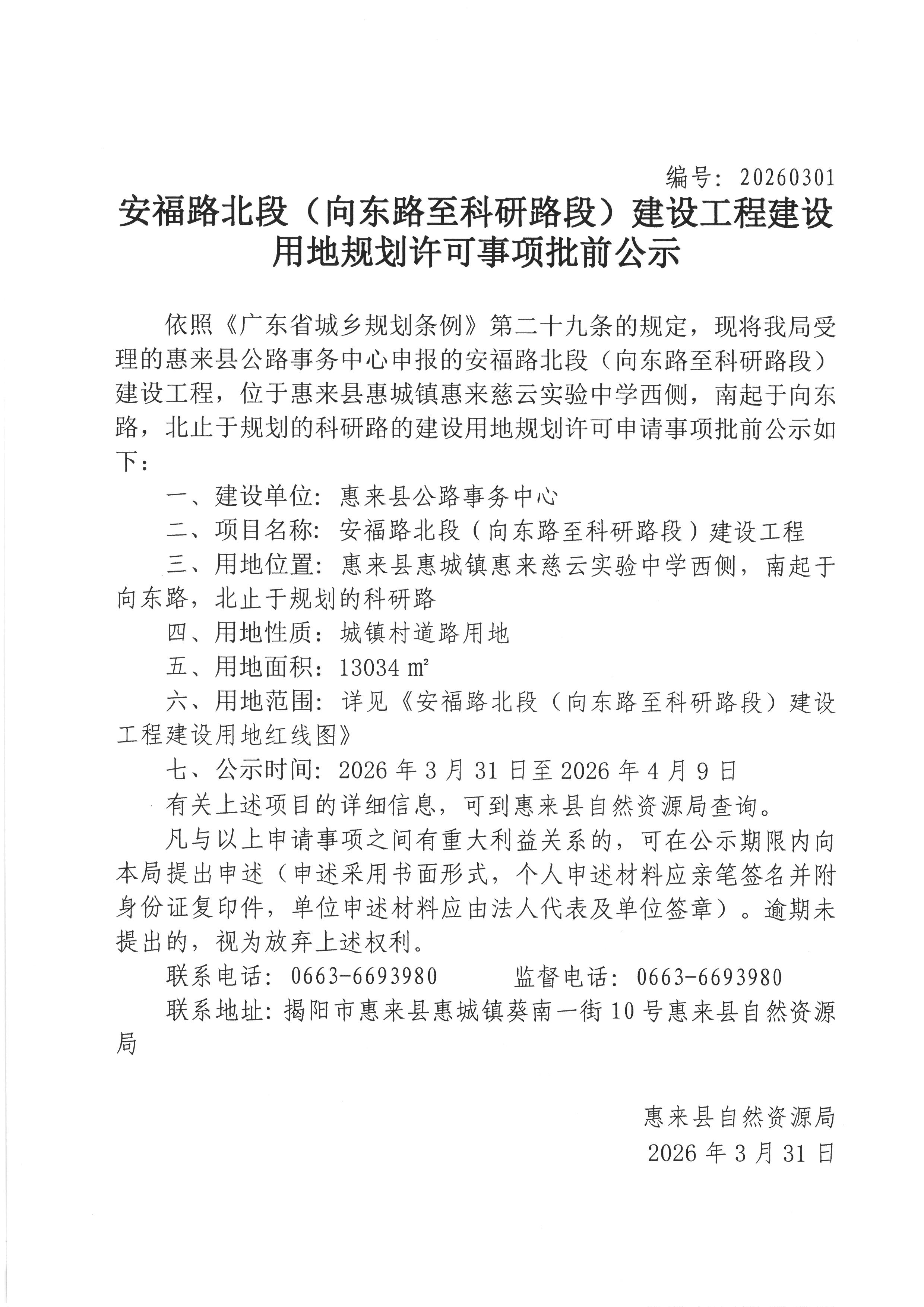 安福路北段(向东路至科研路段)建设工程建设用地规划许可事项批前公示
