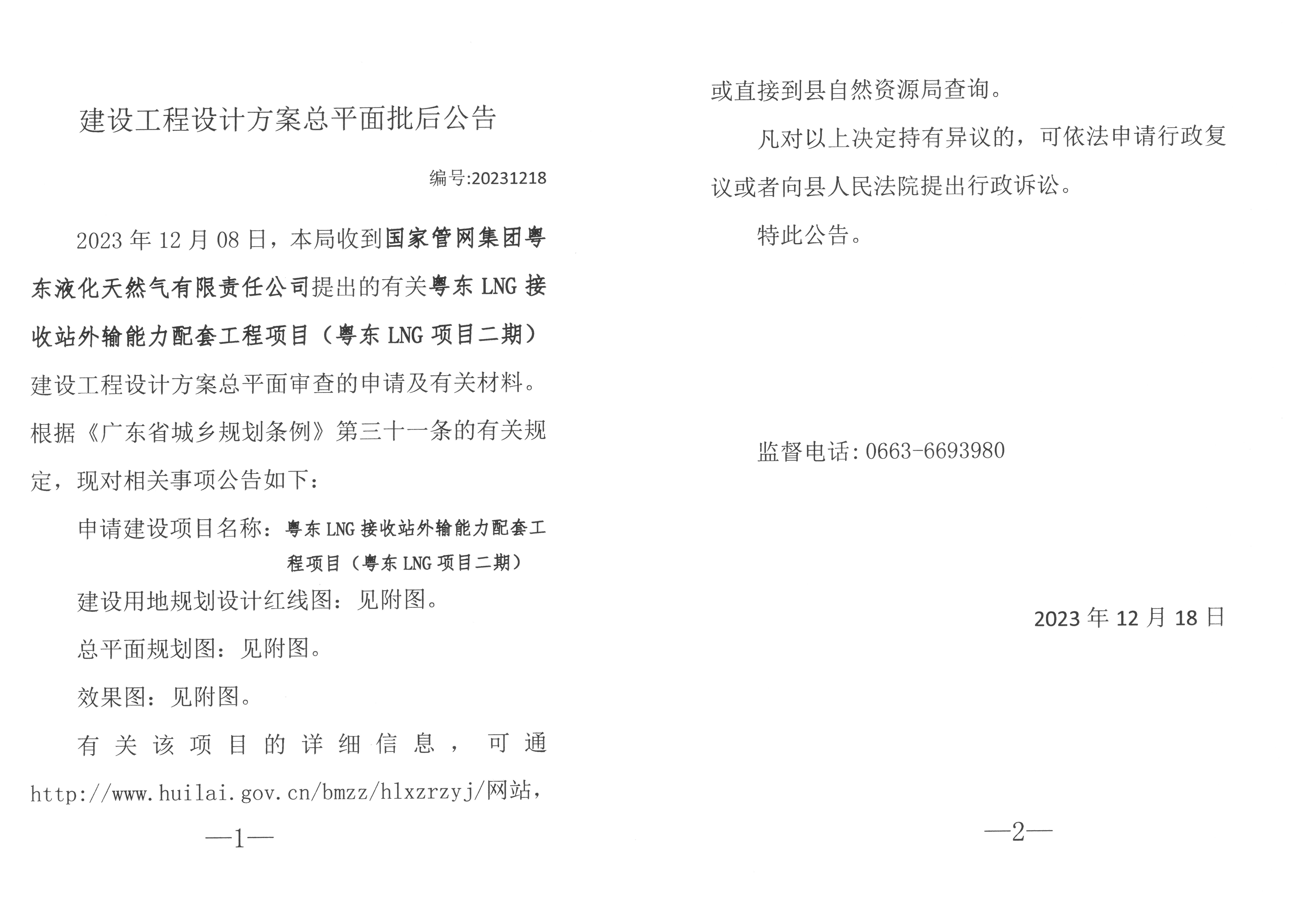 粤东LNG接收站外输能力配套工程项目(粤东LNG项目二期)建设工程设计方案总平面批后公告