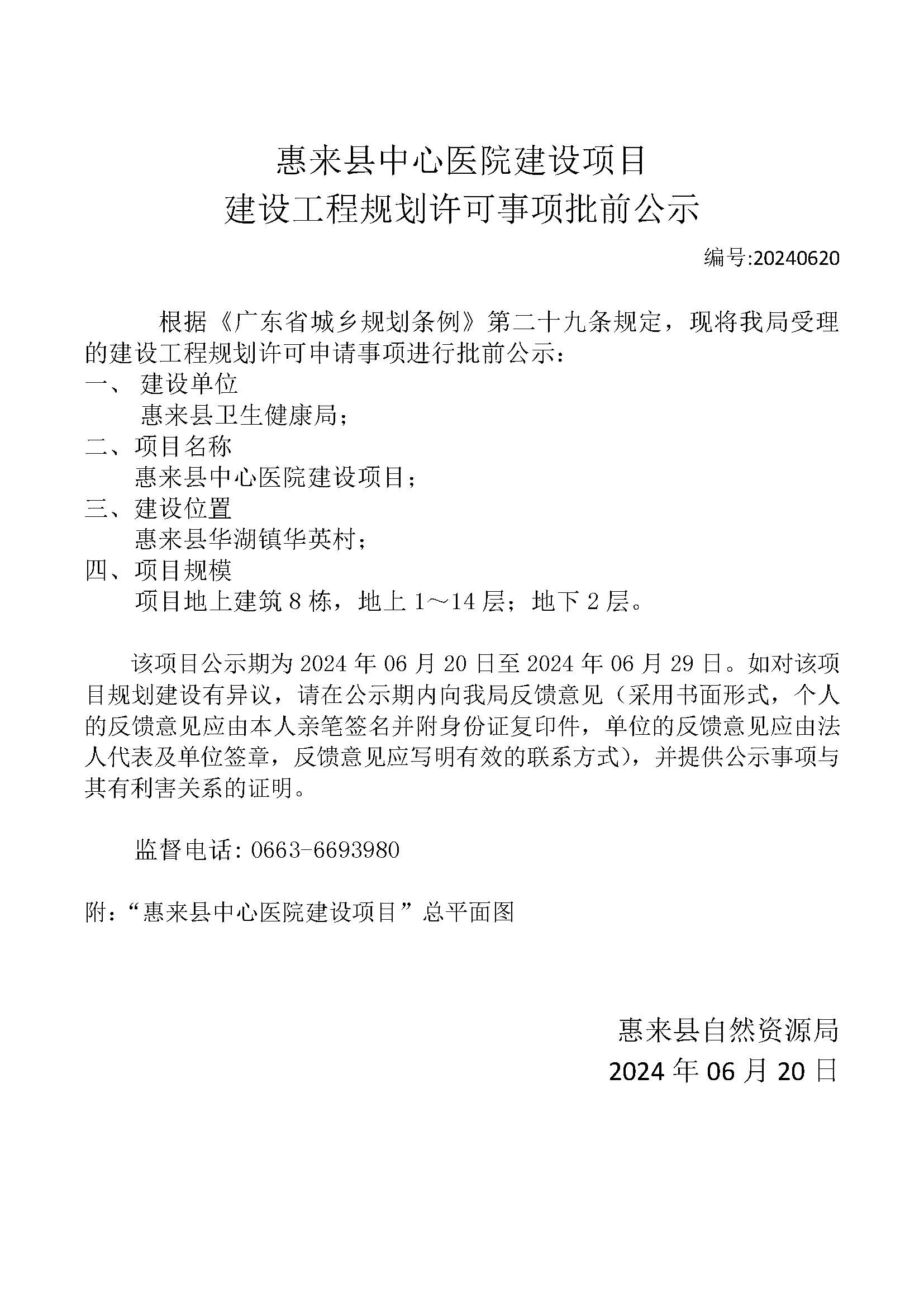 惠来县中心医院建设项目建设工程规划许可证申请公示