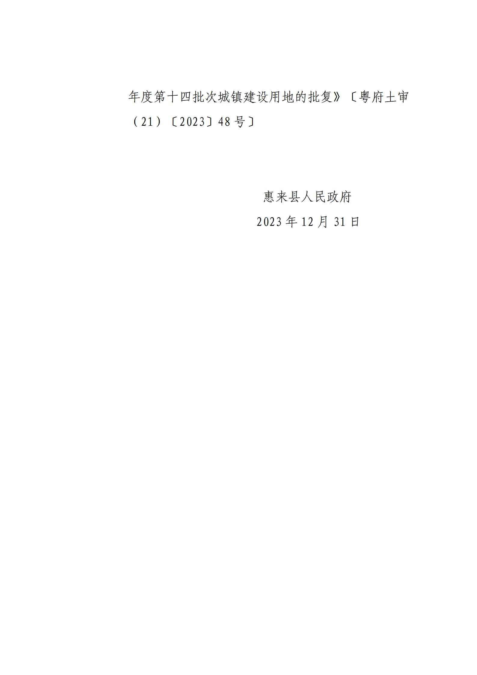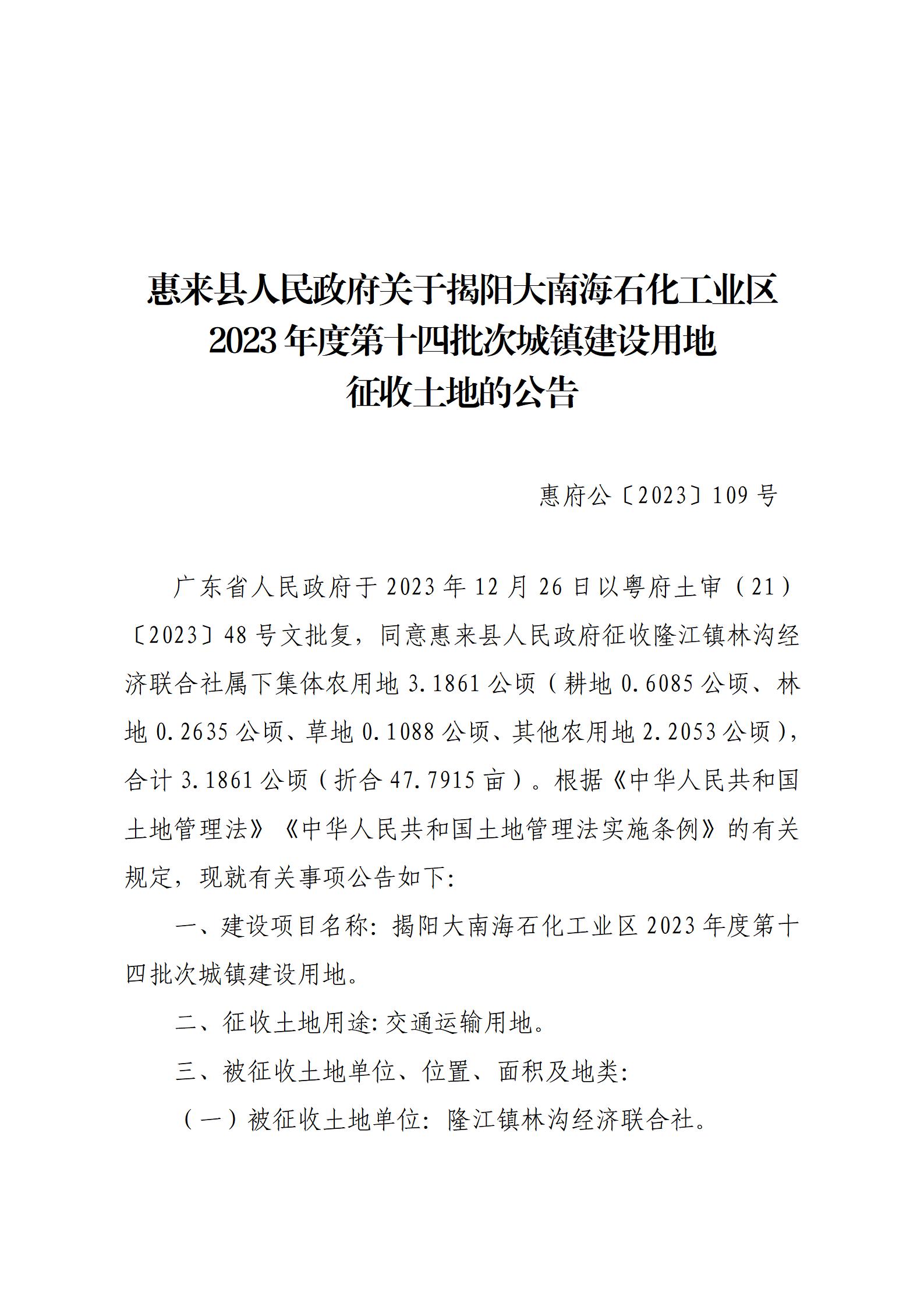 惠来县人民政府关于揭阳大南海石化工业区2023年度第十四批次城镇建设用地征收土地的公告