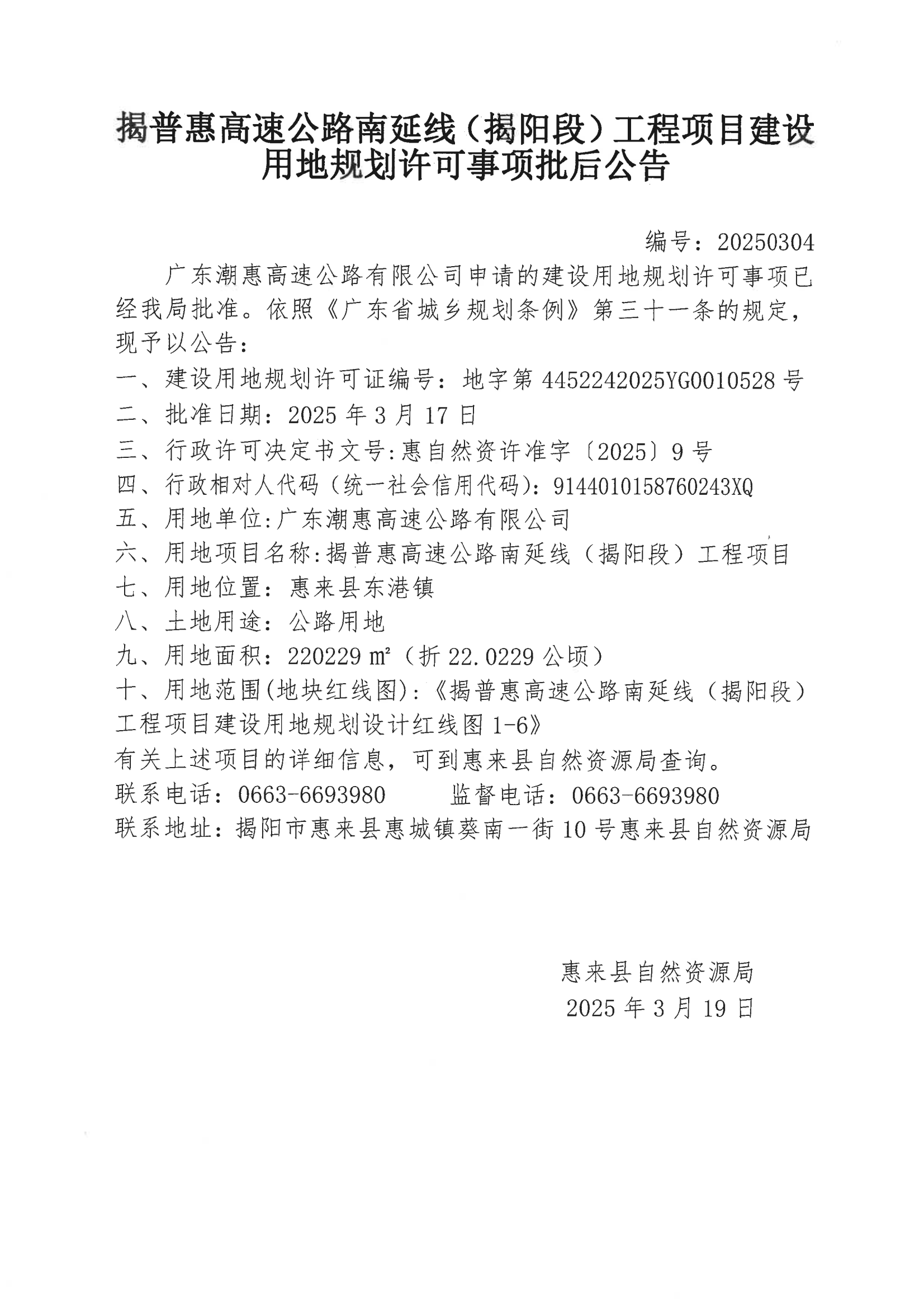 揭普惠高速公路南延线(揭阳段)工程项目建设用地规划许可事项批后公告