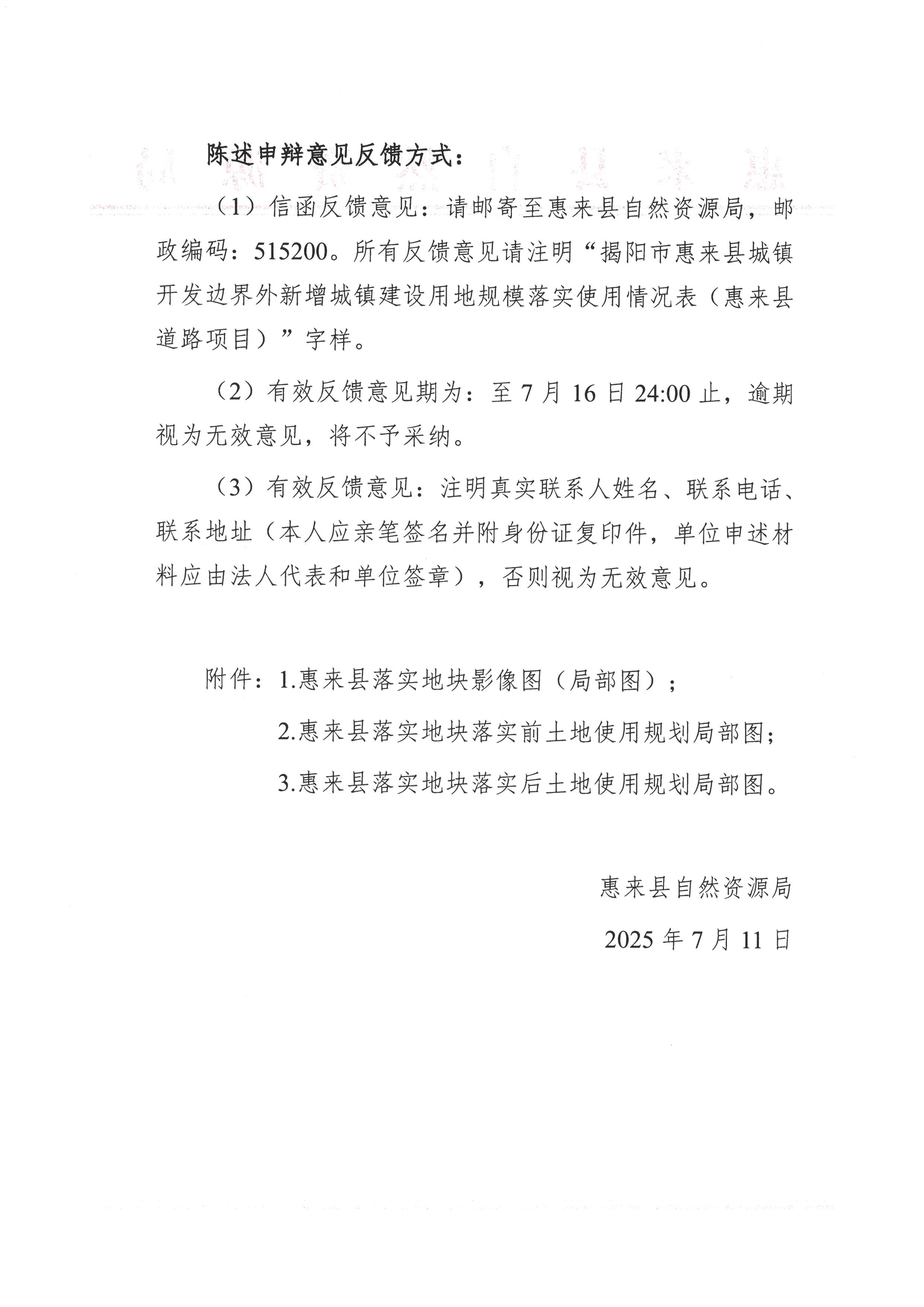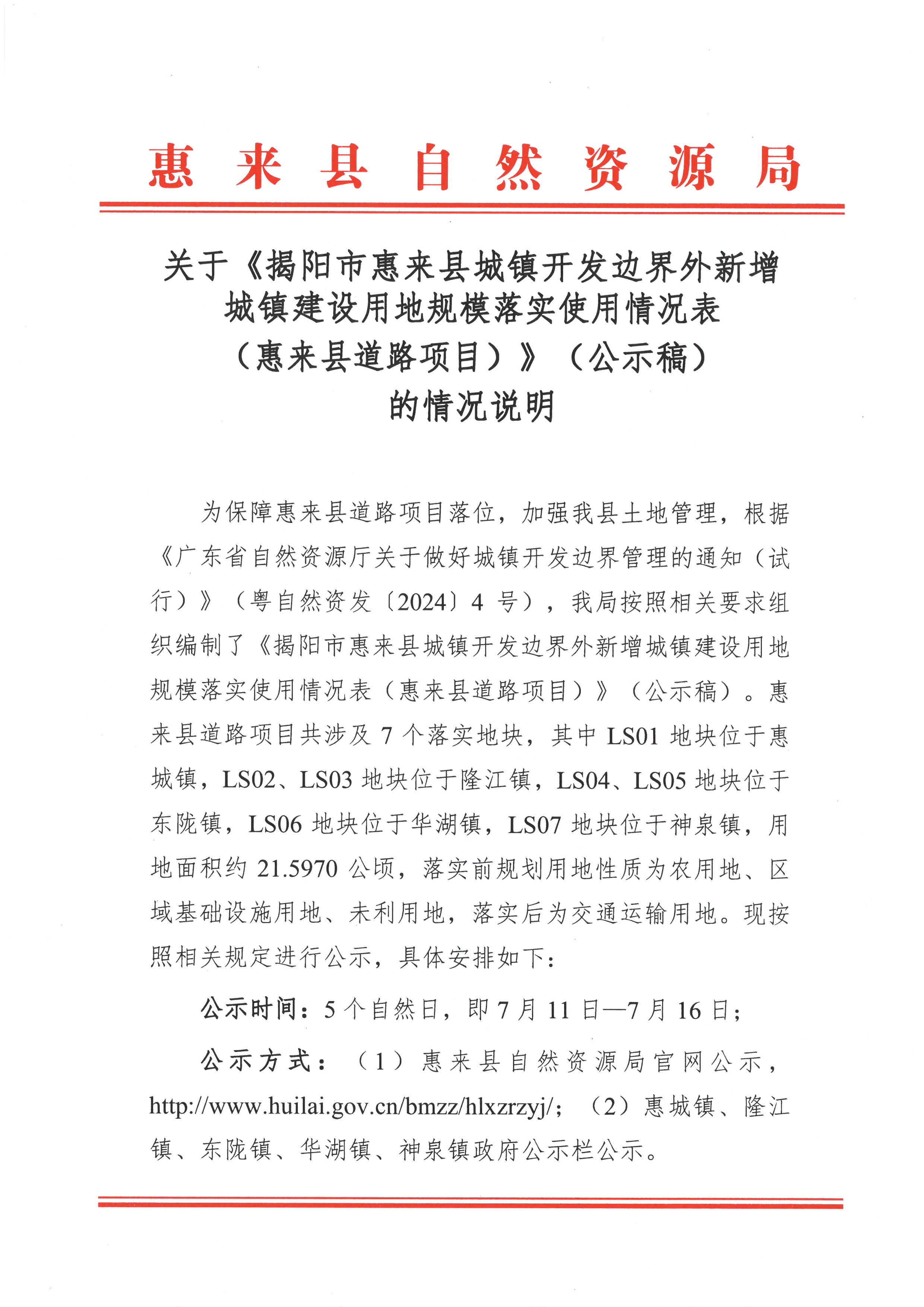 关于《揭阳市惠来县城镇开发边界外新增城镇建设用地规模落实使用情况表(惠来县道路项目)》(公示稿)的说明