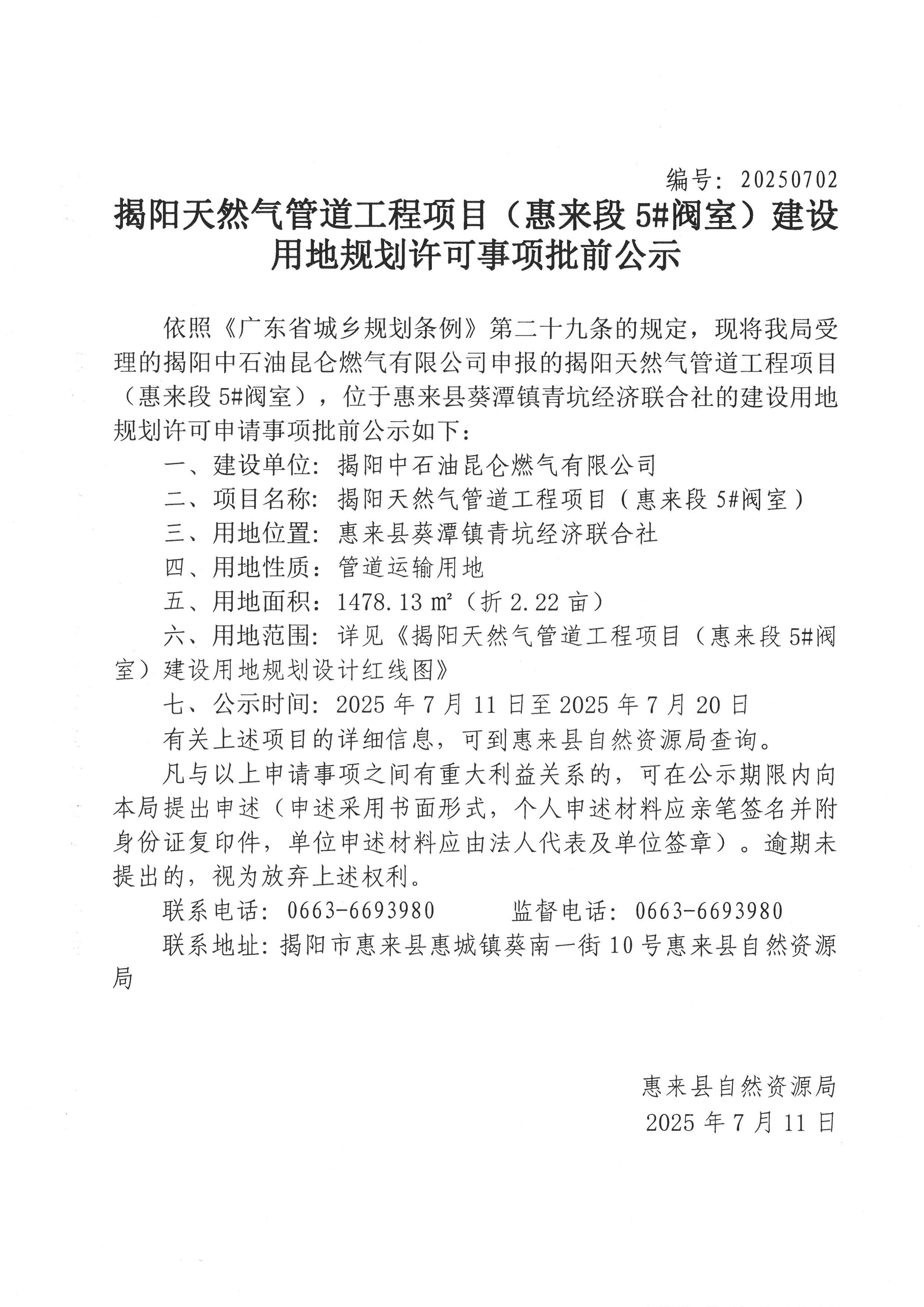 揭阳天然气管道工程项目(惠来段5#阀室)建设用地规划许可事项批前公示
