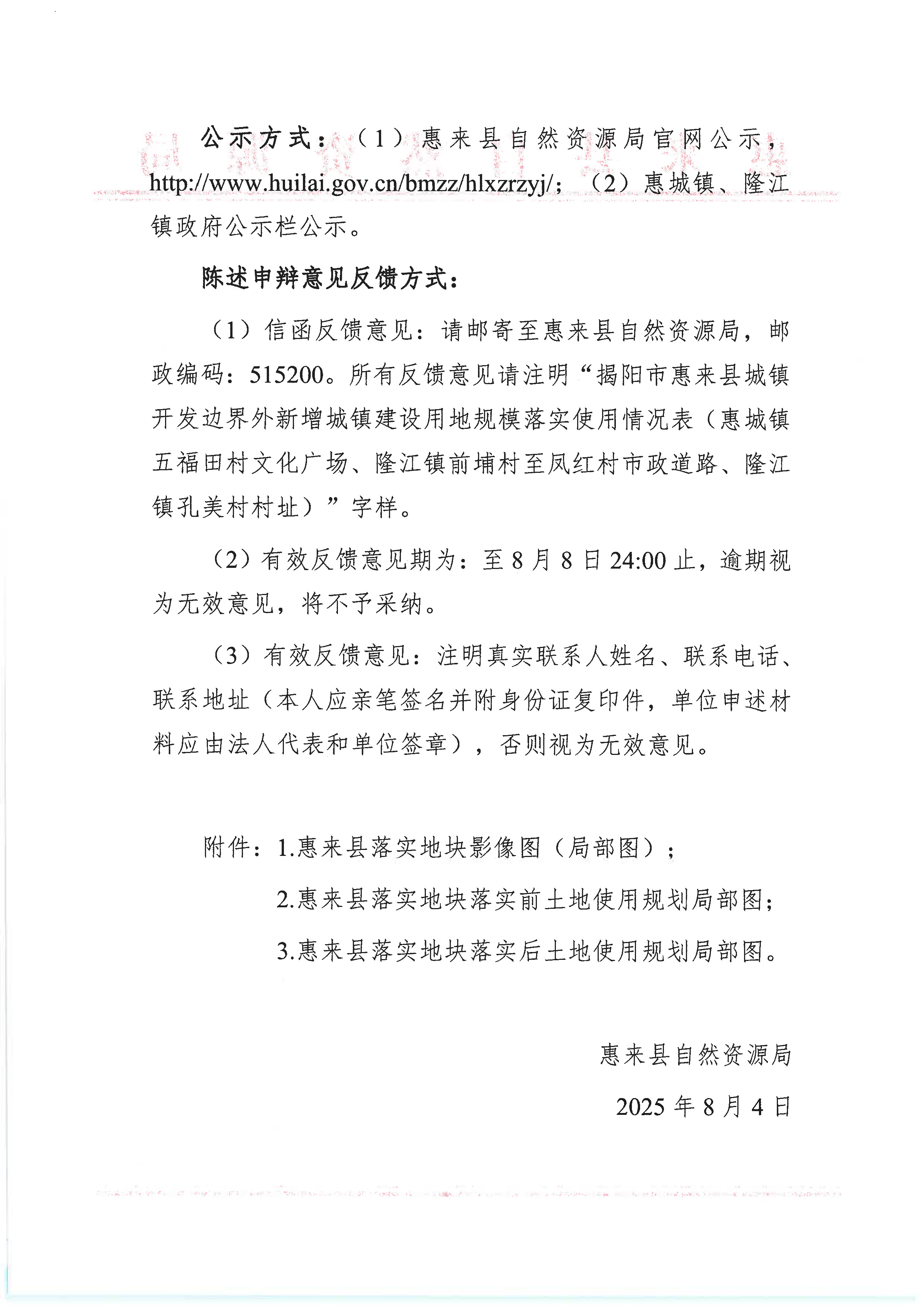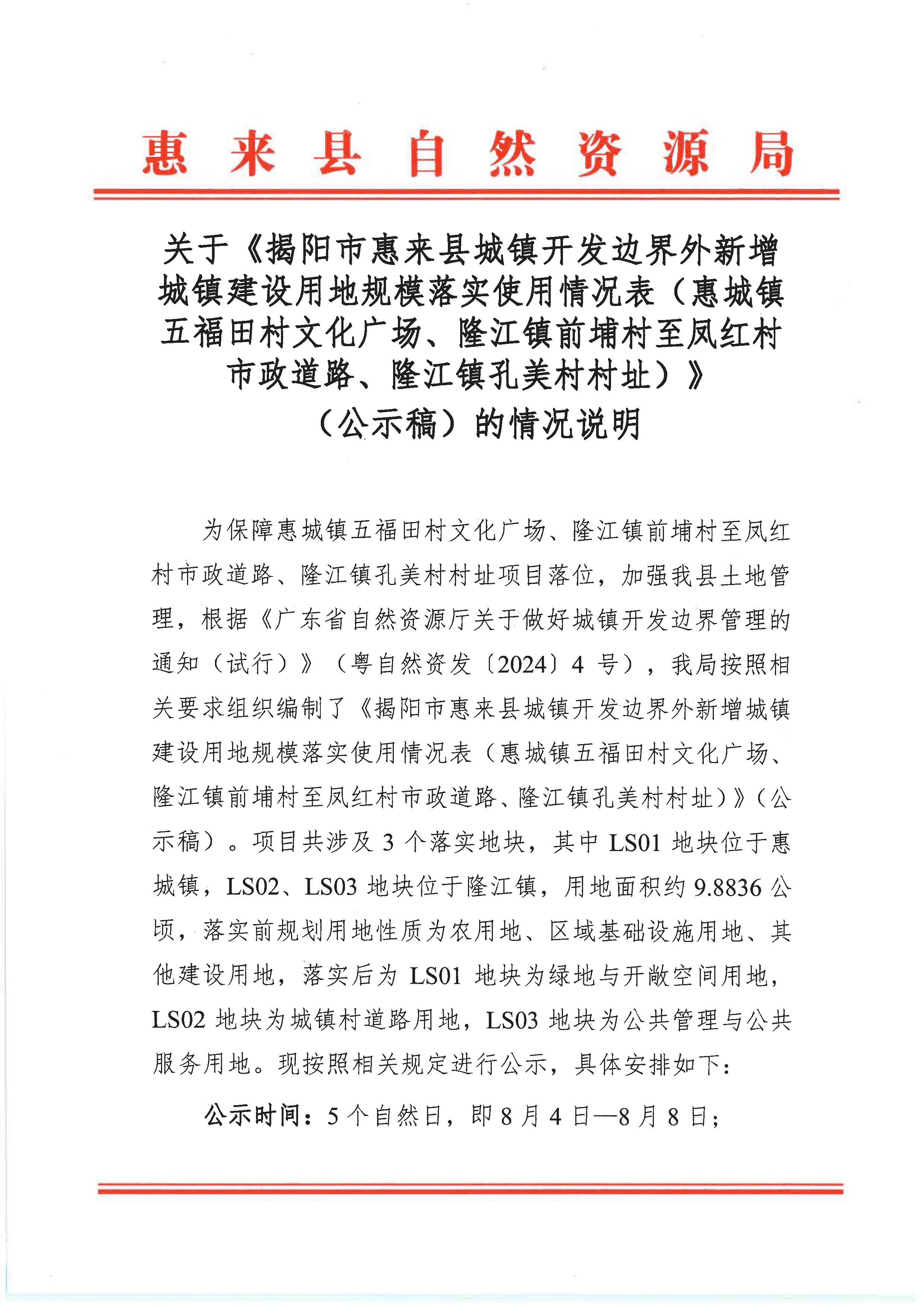关于《揭阳市惠来县城镇开发边界外新增城镇建设用地规模落实使用情况表(惠城镇五福田村文化广场、隆江镇前埔村至凤美村市政道路、隆江镇孔美村村址)》(公示稿)的说明