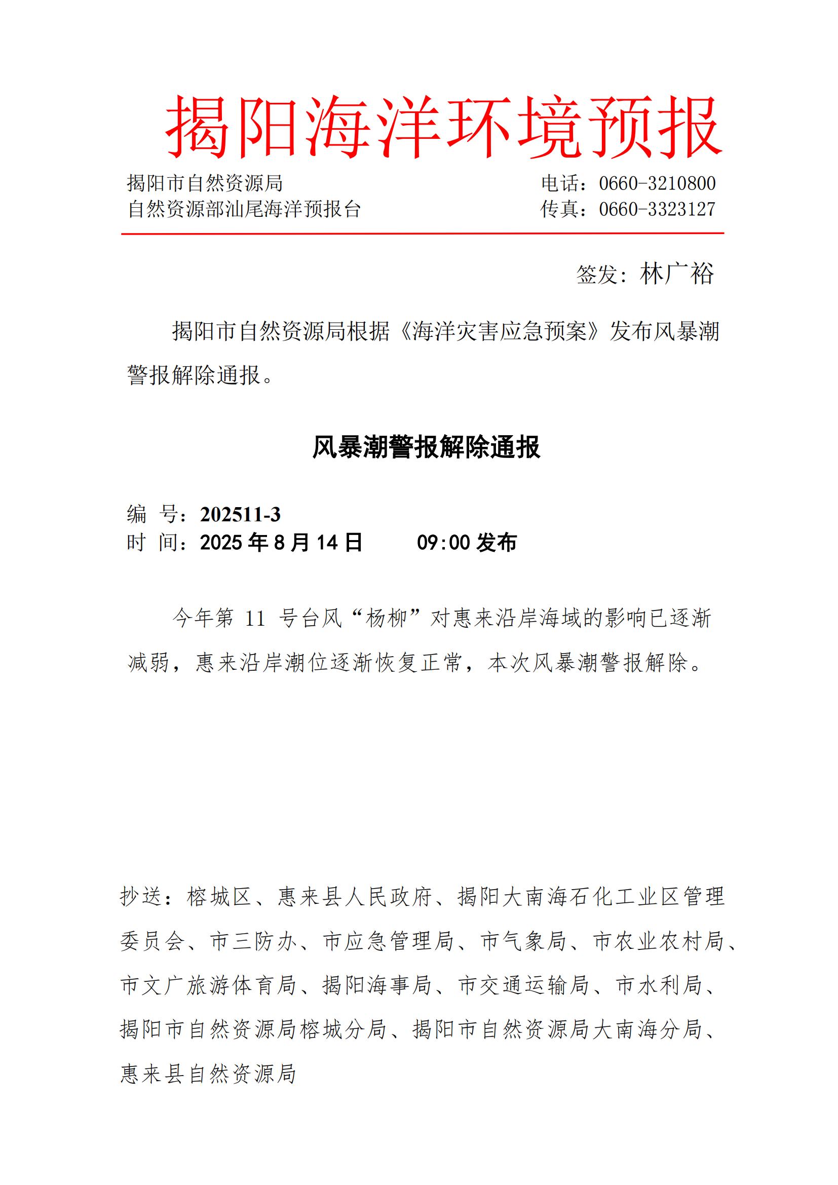 风暴潮警报解除通报 2025年8月14日 9:00