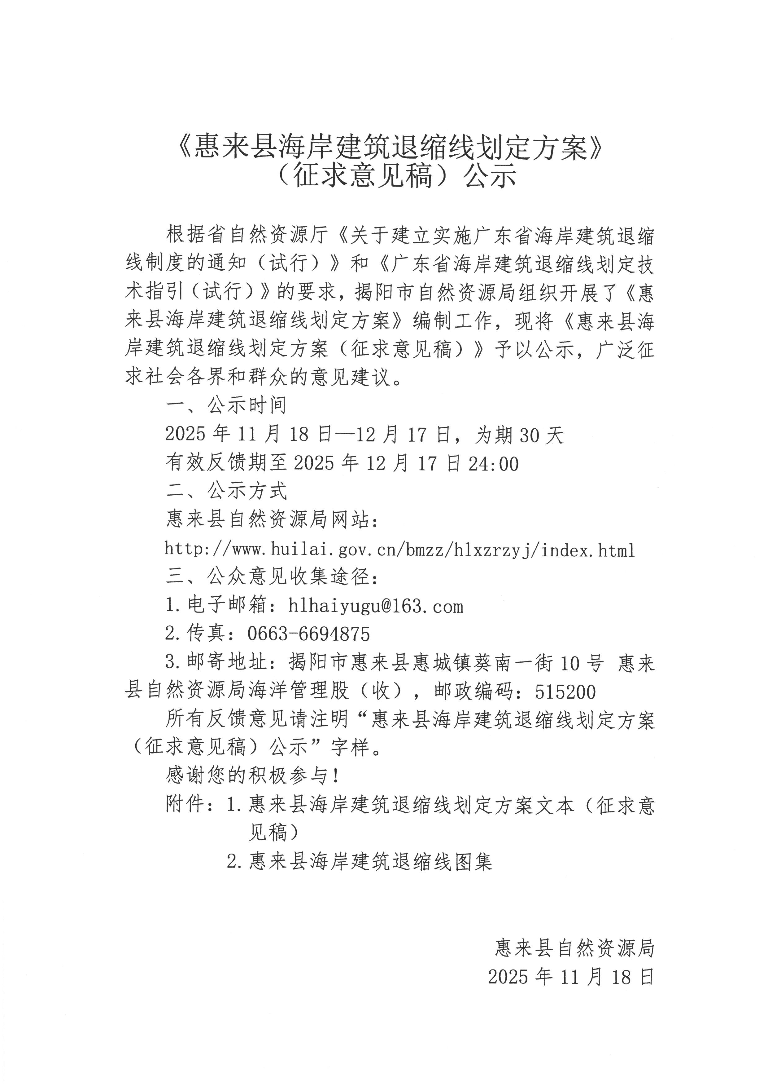 《惠来县海岸建筑退缩线划定方案》(征求意见稿)公示