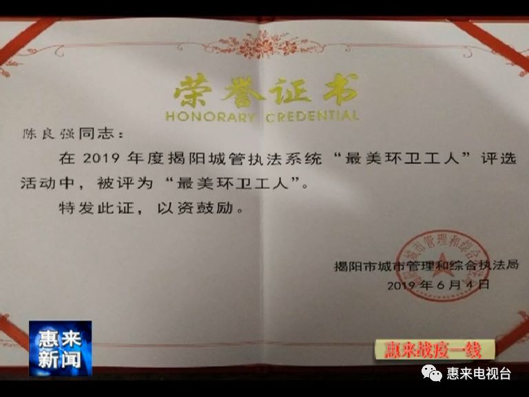 自新冠肺炎疫情发生以来,环卫工作成为了抗“疫”的第一道防线。作为“城市卫生守护者”,陈良强同志与全体环卫工人一样,不畏垃圾异味、不畏传染危险,坚持不怕脏、不怕累、不怕险的拼搏精神,坚守户外作业,没有一天休息假,在口罩、手套等劳动防护用品短缺之际,仍然主动加班加点,全力以赴加大对道路、公共区域和卫生死角的垃圾收集清运和“消毒杀菌”的“高频次”作业。