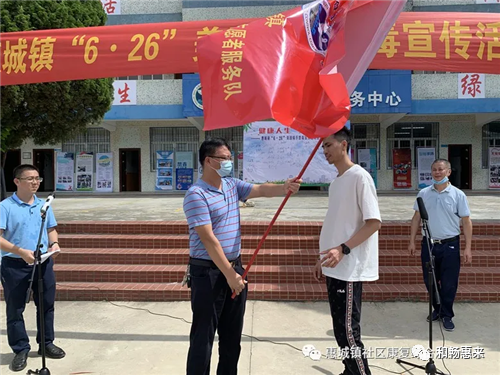 活动还进行授旗仪式,镇长杨松泉为惠来美团外卖经理林子文授予“惠城镇禁毒宣传志愿者服务队”旗帜。