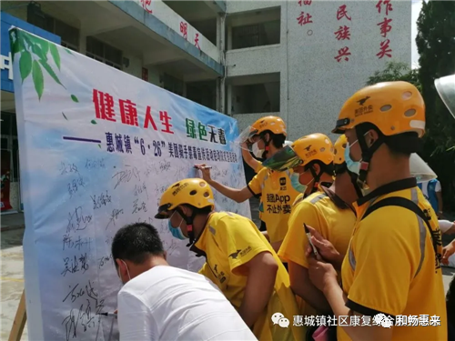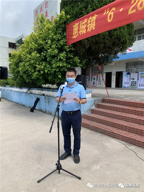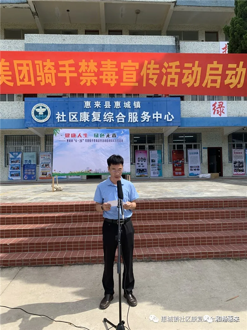 6月26日上午,在第33个国际禁毒日来临之际,惠城镇在社区康复综合服务中心举行了“6·26”美团骑手禁毒宣传活动启动仪式。县委常委、惠城镇委书记林朝阳,镇长杨松泉、镇委副书记林庆林、镇综治办专职副主任詹史龙、惠城派出所所长张裕展、城东派出所所长吴育群、河林派出所教导员邱木金、惠来美团外卖经理林子文、各社区治调主任、惠城镇社区康复综合服务中心社工、美团骑手等共120多人参加了活动。活动由惠城镇委副书记林庆林主持。