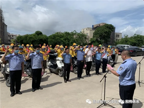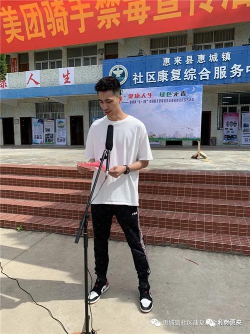 惠来美团外卖经理林子文代表骑手作了表态发言,他表示惠来美团外卖将积极践行企业的社会责任,加强员工的管理和培训,将禁毒知识宣传出去,并表示在今后的禁毒志愿服务中,美团骑手要勇做禁毒先锋,从点滴做起,从身边做起,从现在做起,为惠城禁毒工作做出应有的贡献。