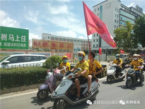 启动仪式结束后,参加活动的110名美团骑手集中组成骑行队伍,统一张贴好发放的禁毒宣传贴纸与旗帜,从惠城镇社区康复综合服务中心出发,沿着葵和大道、南门大街等主要路段一路整齐有序地骑行。社工在骑行队伍后,针对过往人群及商户,发放禁毒宣传袋与宣传单,讲解防毒禁毒相关知识。