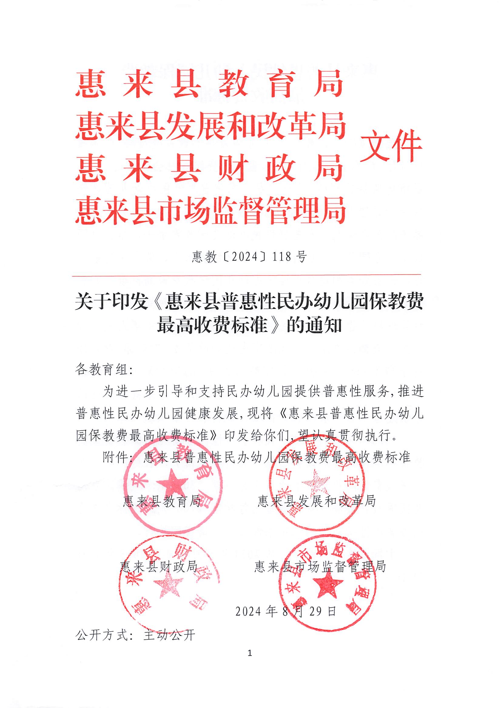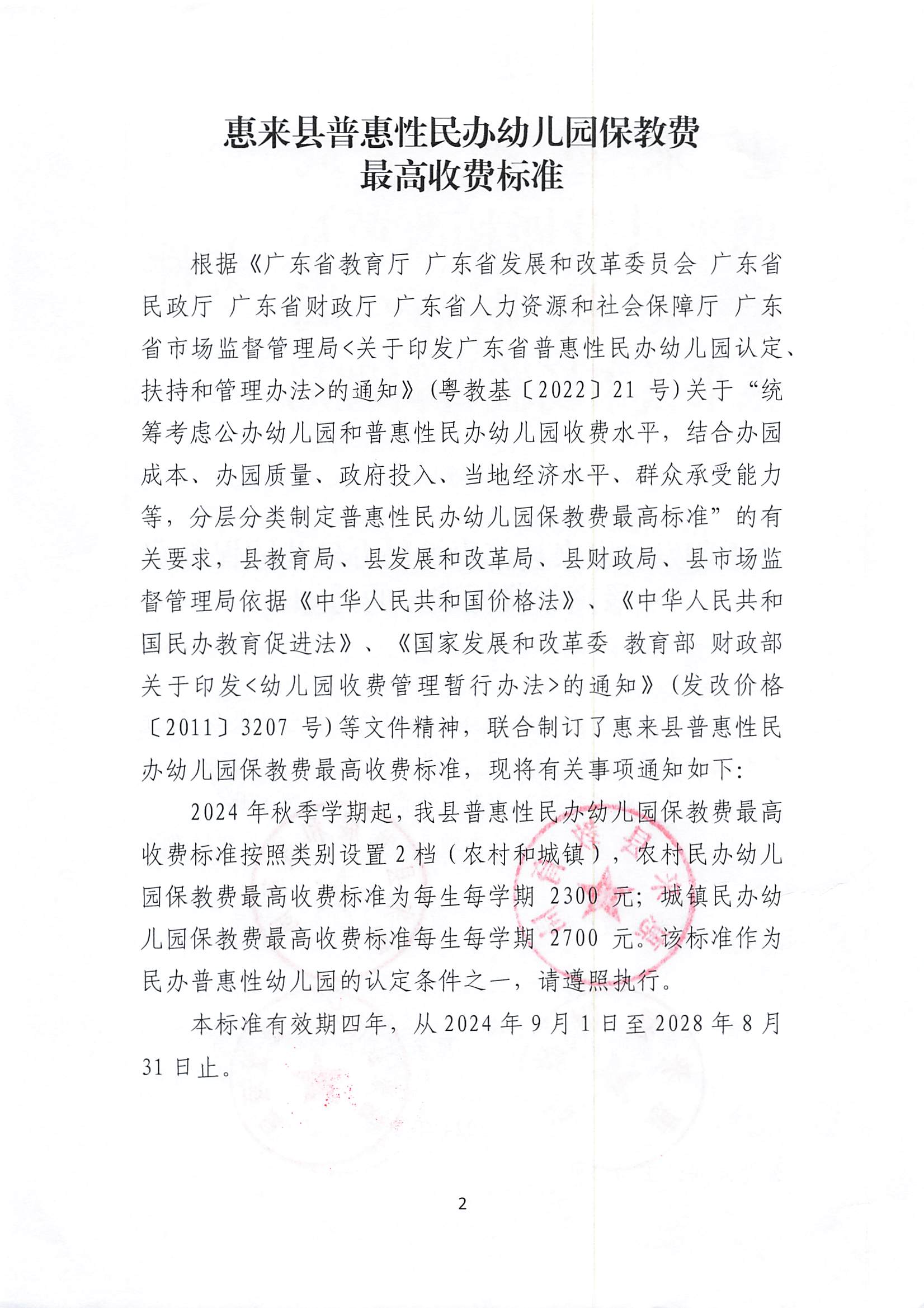 关于印发《惠来县普惠性民办幼儿园保教费最高收费标准》的通知