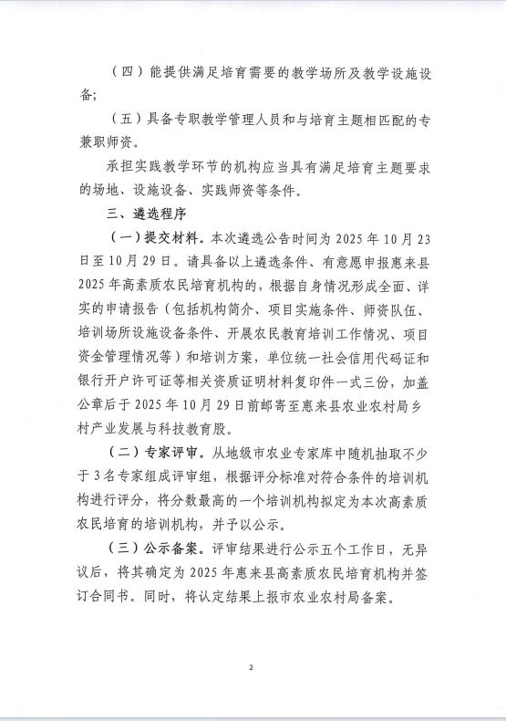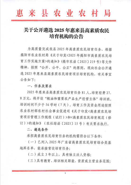 | 名称: | 关于公开遴选2025年惠来县高素质农民培育机构的公告 | ||