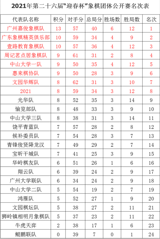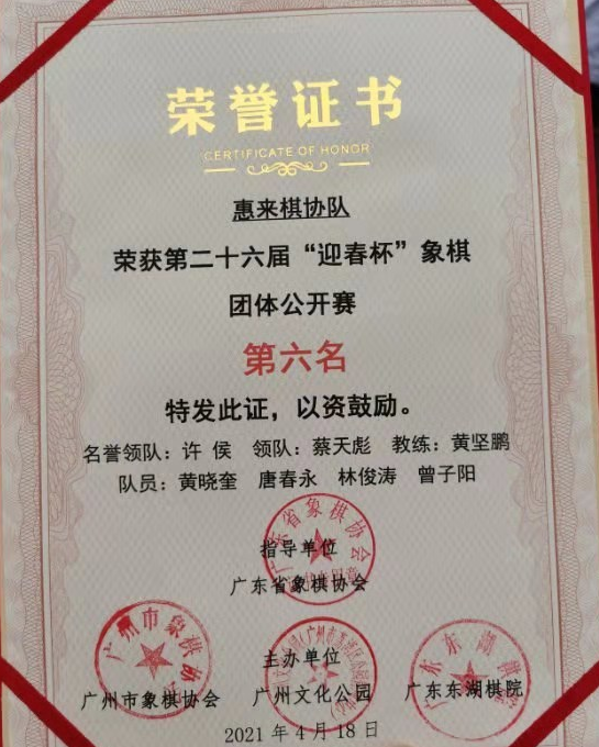 近日,由省象棋协会、广州市象棋协会、广州文化公园和广东东湖棋院联合主办的第二十六届“迎春杯”象棋团体公开赛在广州文化公园隆重举行。经过两天七轮的激烈较量,于4月18日下午圆满落下帷幕。惠来棋协队发扬紧密团结、胜不骄败不馁、顽强拼搏的团队精神,在众多强队中,顶住压力、艰难杀出重围,最终以三胜三和一负的战绩荣获第六名,创下参加该项赛事历史最好成绩。