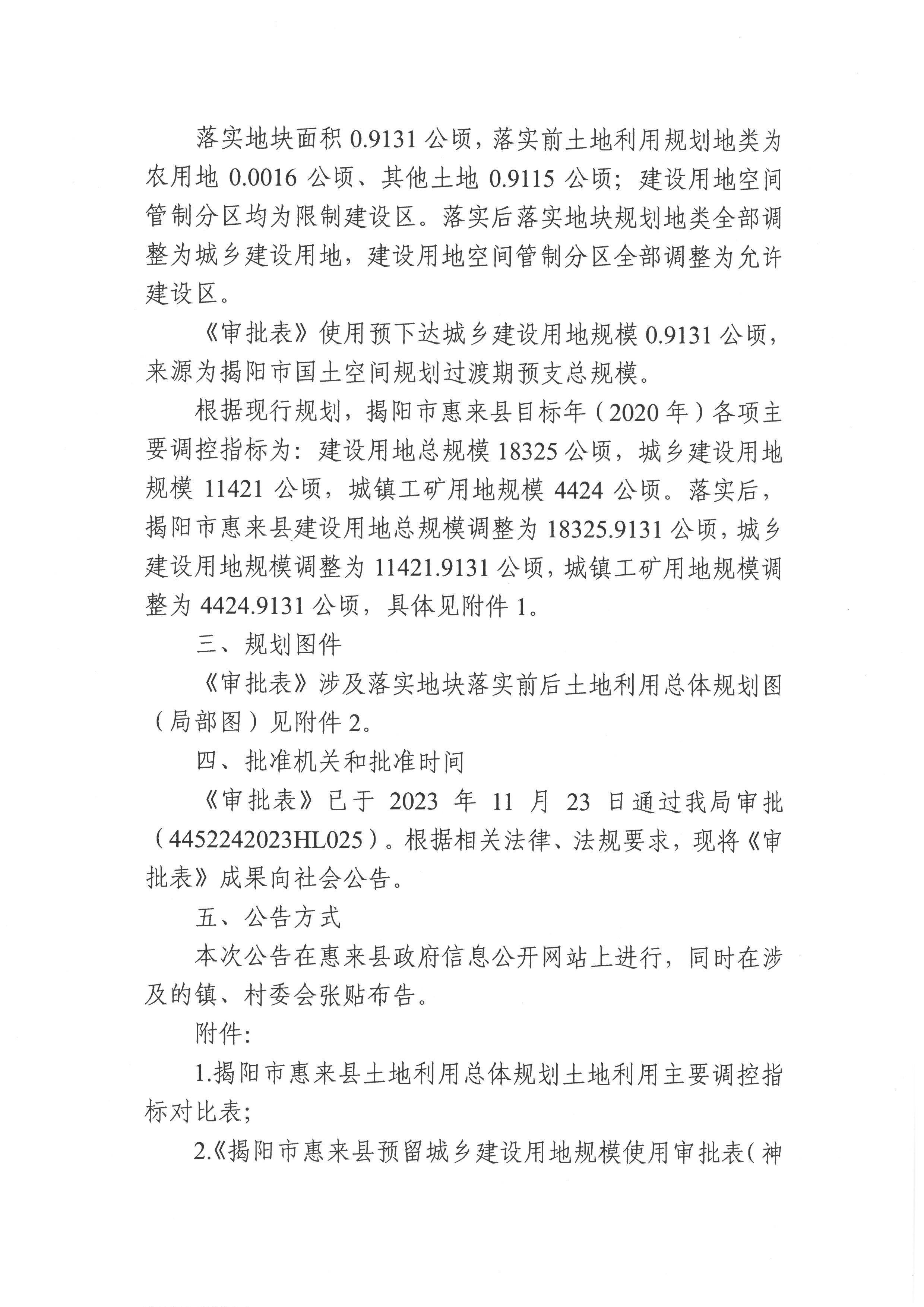 关于《揭阳市惠来县预留城乡建设用地规模使用审批表(神泉镇桃美村留用地)》成果的公告