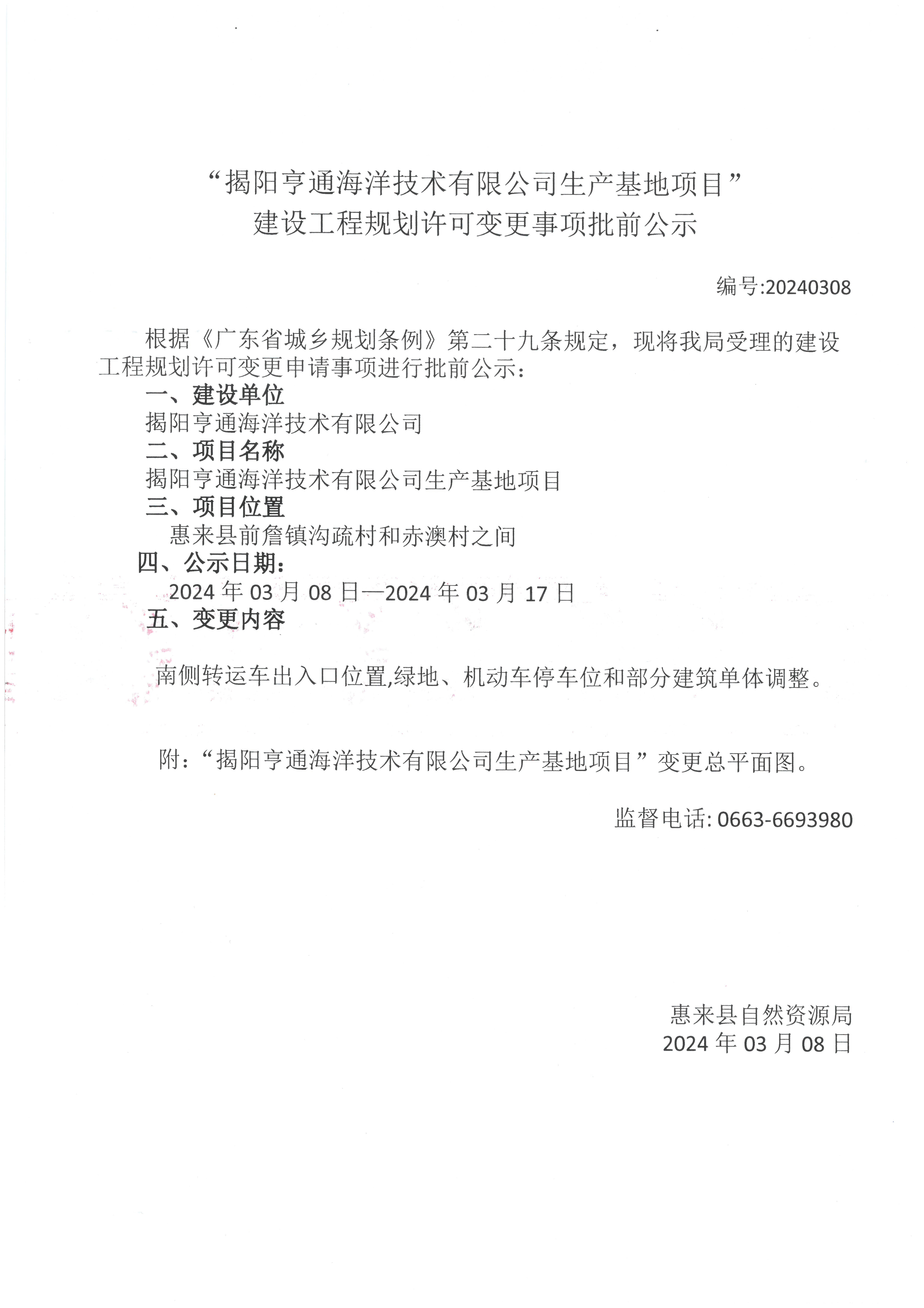 | 名称: | “揭阳亨通海洋技术有限公司生产基地项目”建设工程规划许可变更事项批前公示 | ||