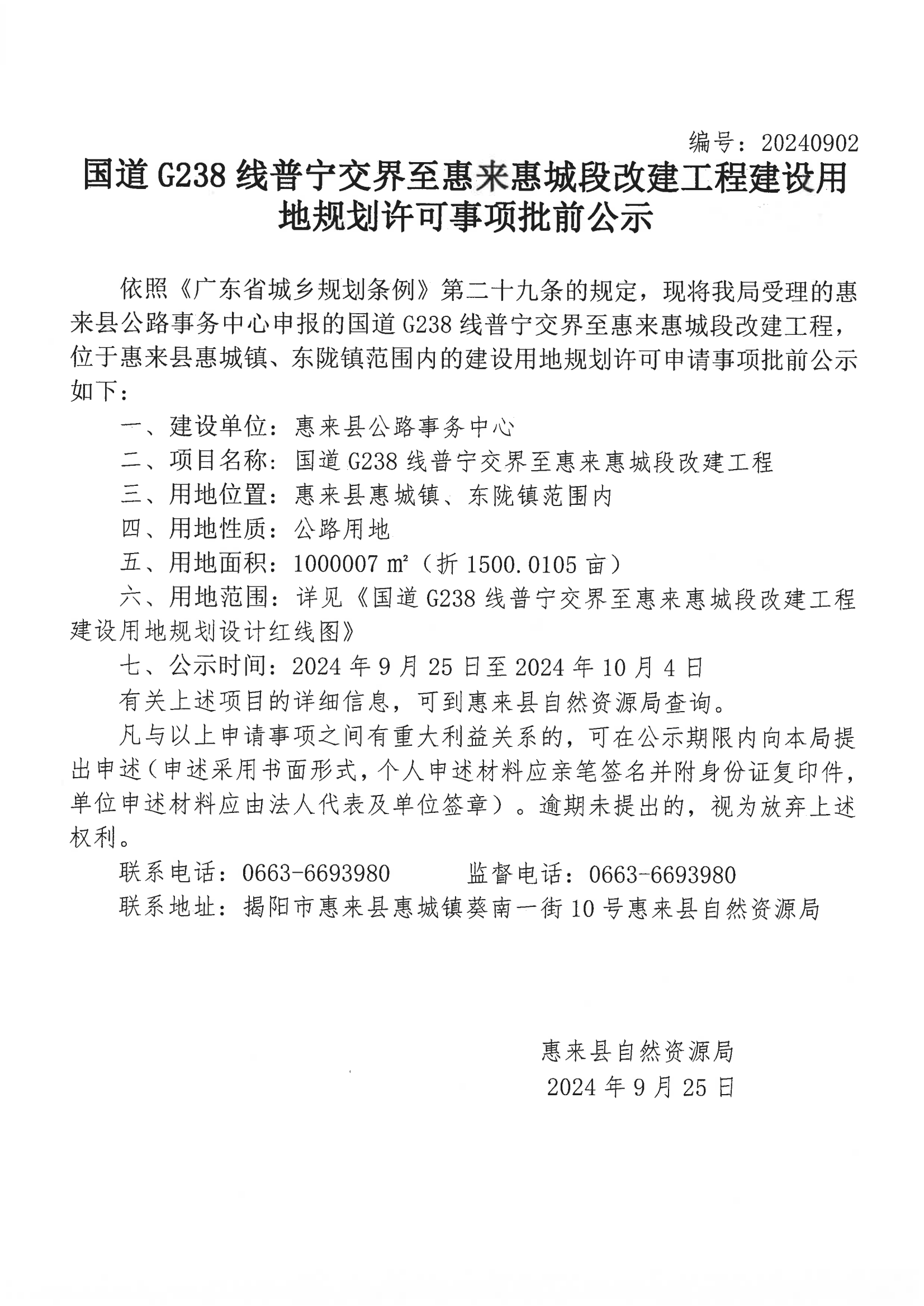 国道G238线普宁交界至惠来惠城段改建工程建设用地规划许可事项批前公示