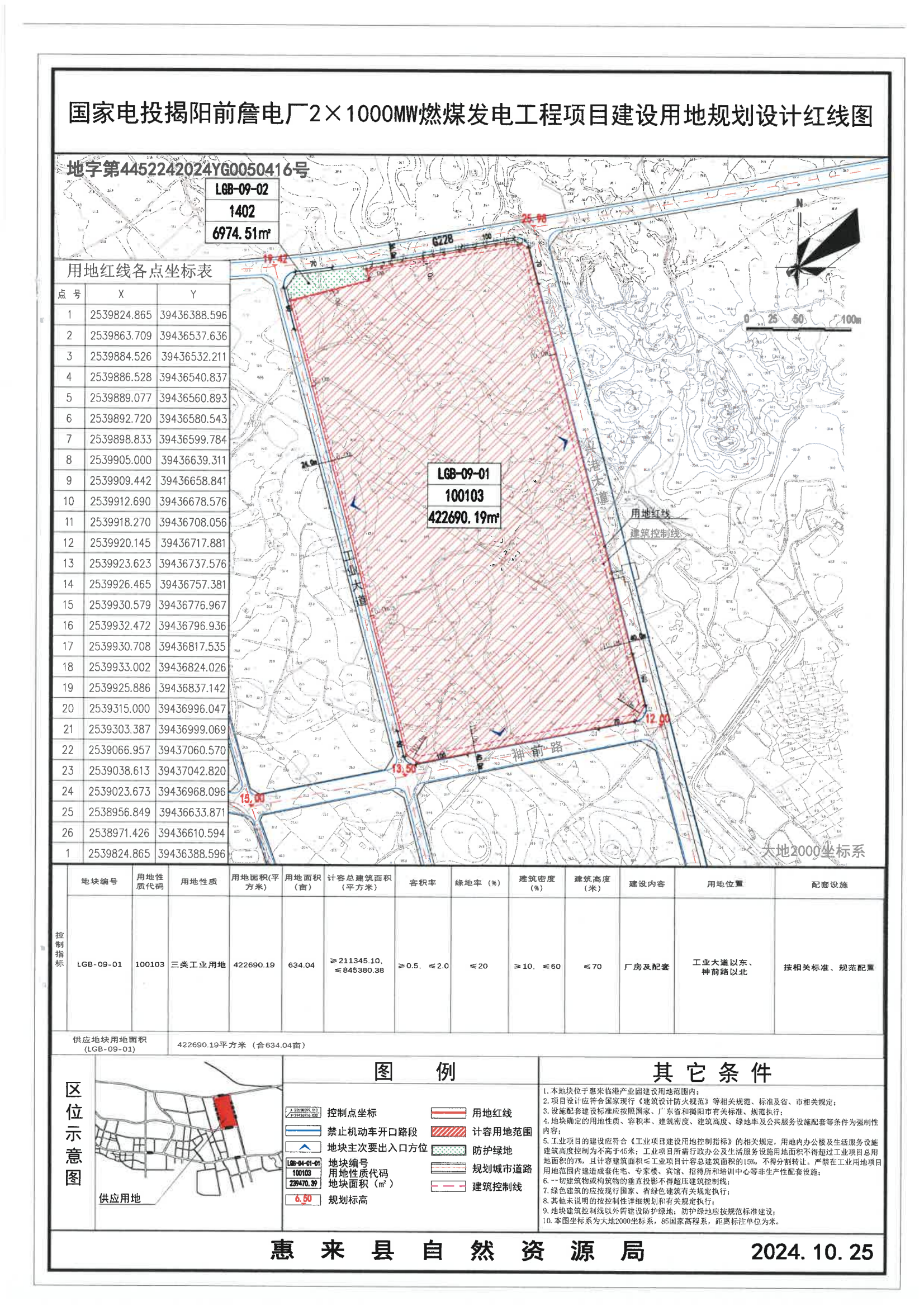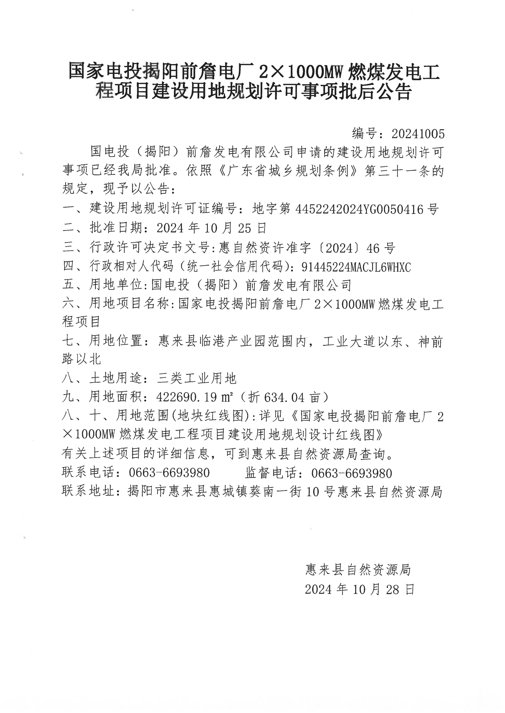 国家电投揭阳前詹电厂2×1000MW燃煤发电工程项目建设用地规划许可事项批后公告