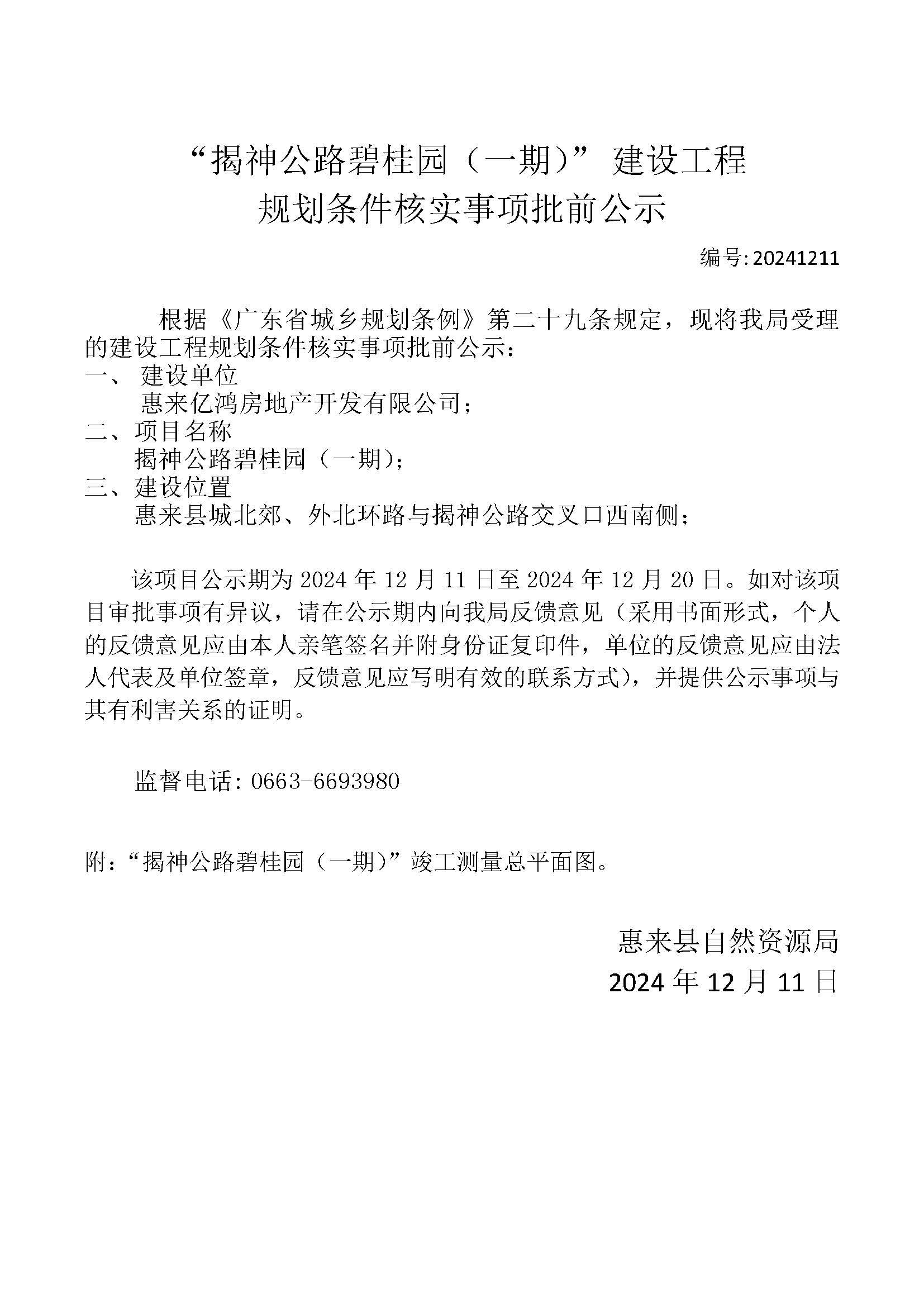 揭神公路碧桂园(一期)建设工程规划条件核实批前公示