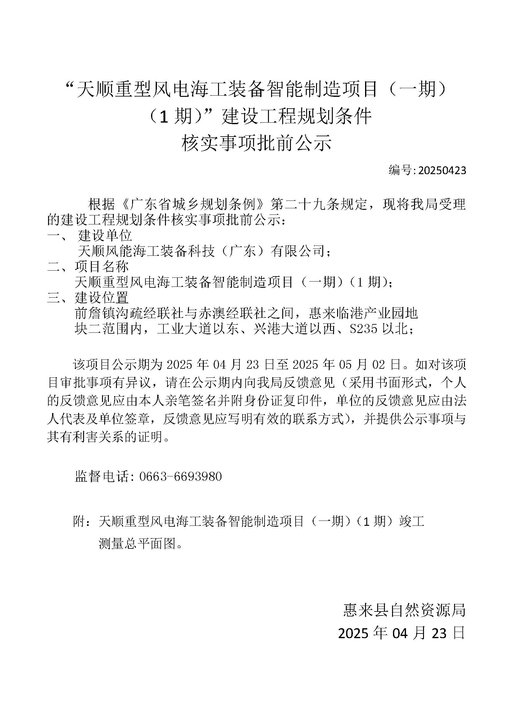 | 名称: | “天顺重型风电海工装备智能制造项目(一期)(1期)”建设工程规划条件核实事项批前公示 | ||