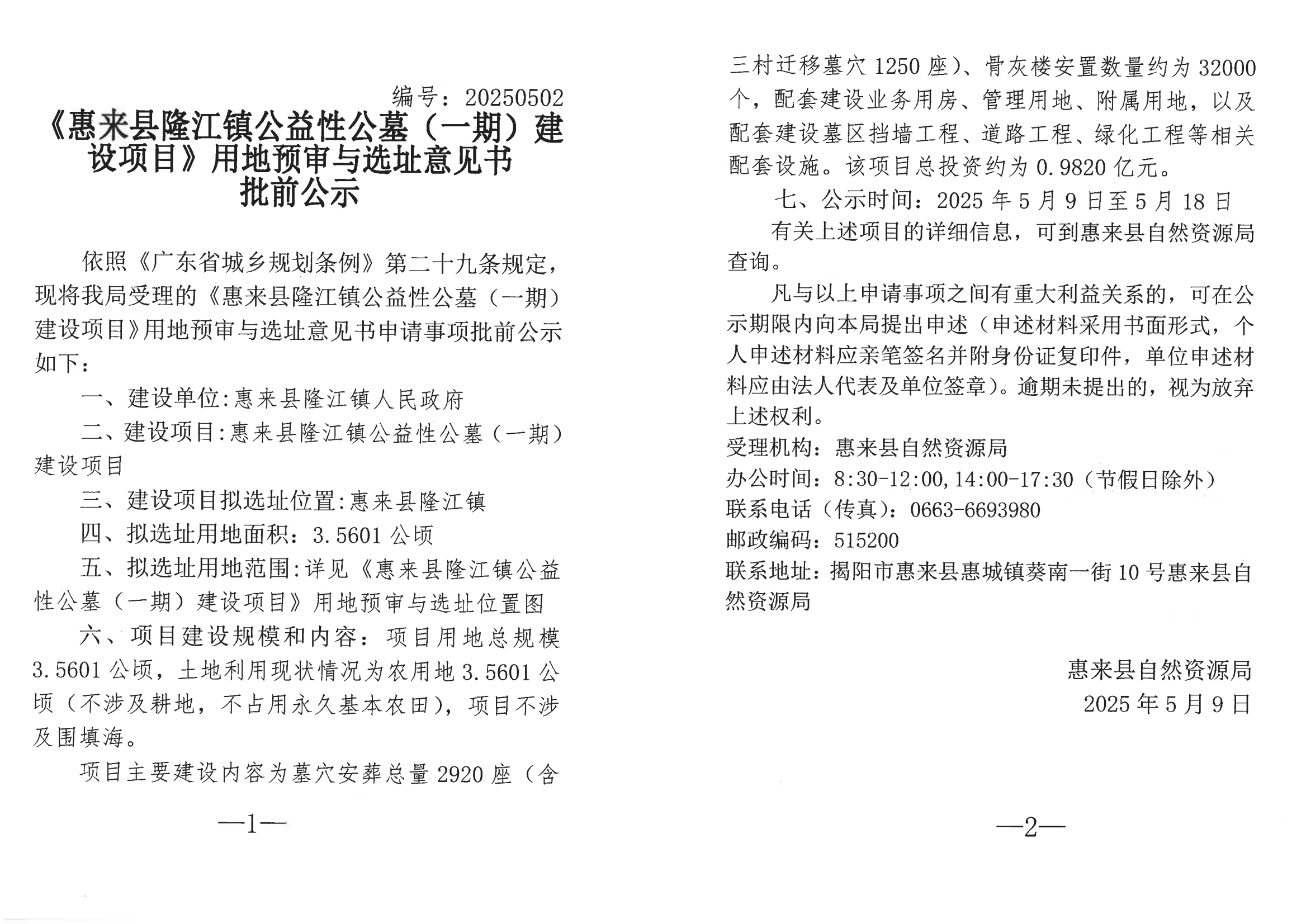 《惠来县隆江镇公益性公墓(一期)建设项目》用地预审与选址意见书批前公示