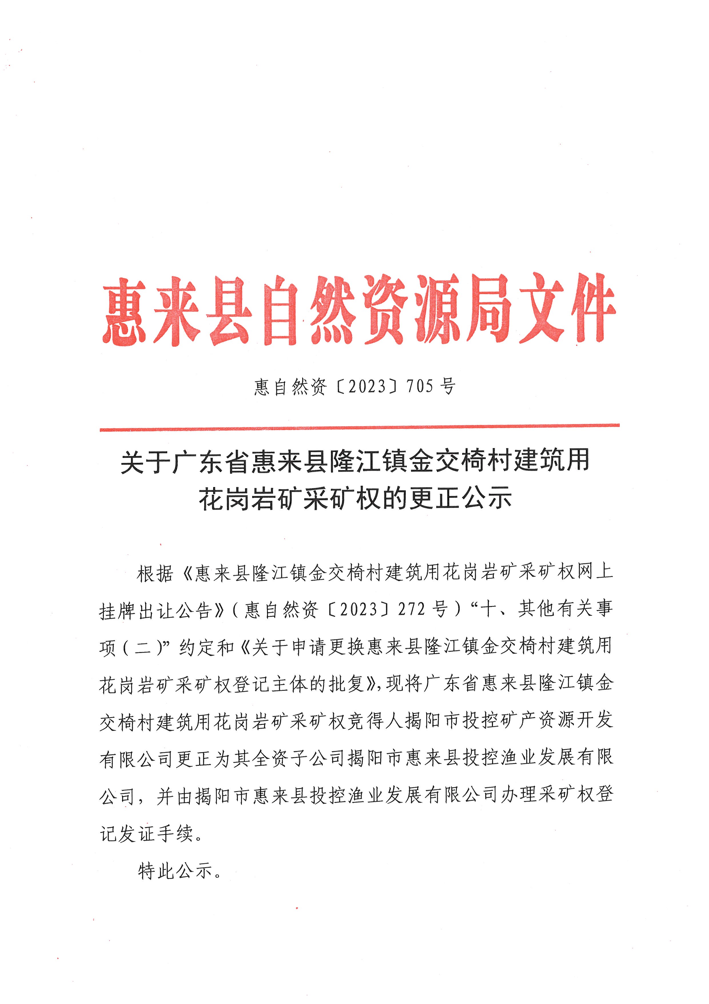 关于广东省惠来县隆江镇金交椅村建筑用花岗岩矿采矿权的更正公示