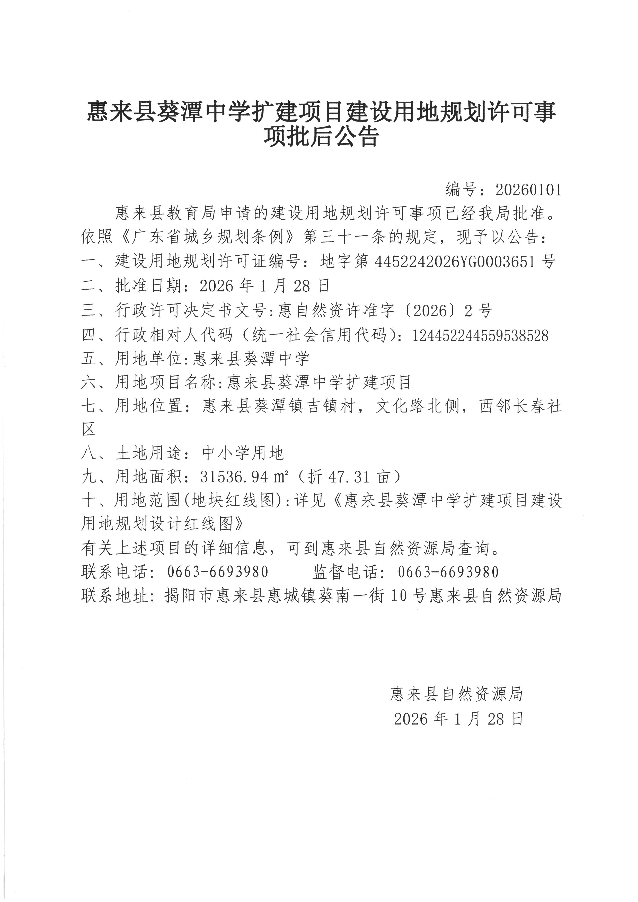惠来县葵潭中学扩建项目建设用地规划许可事项批后公告