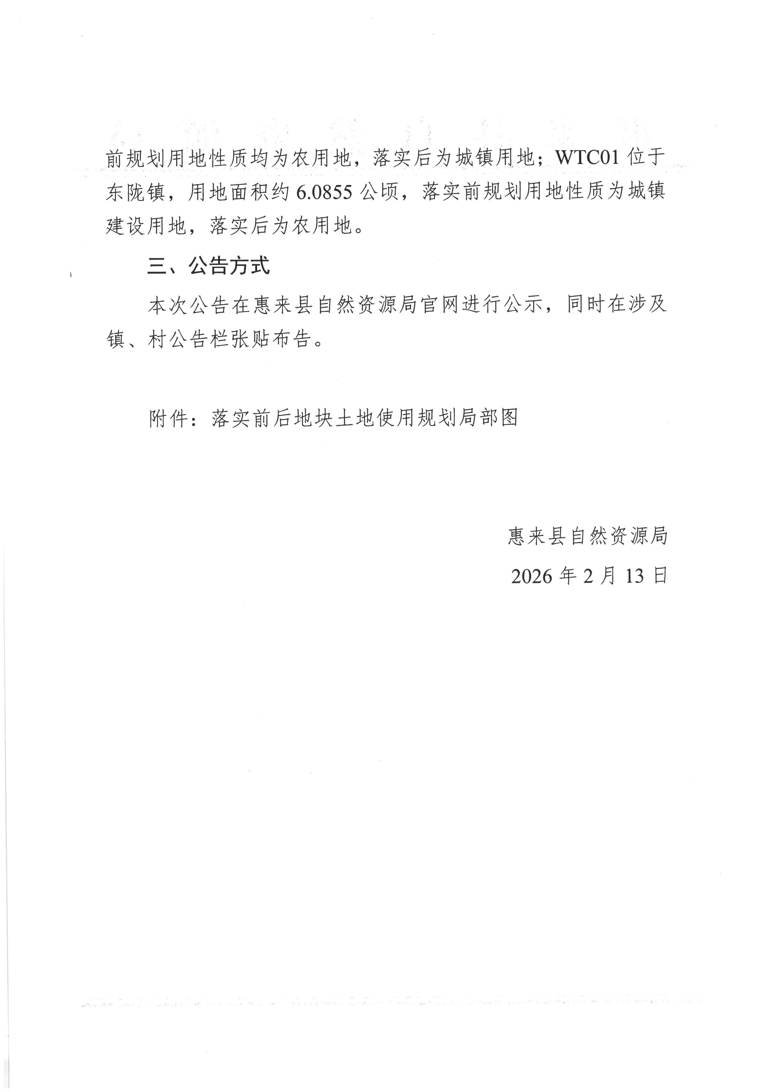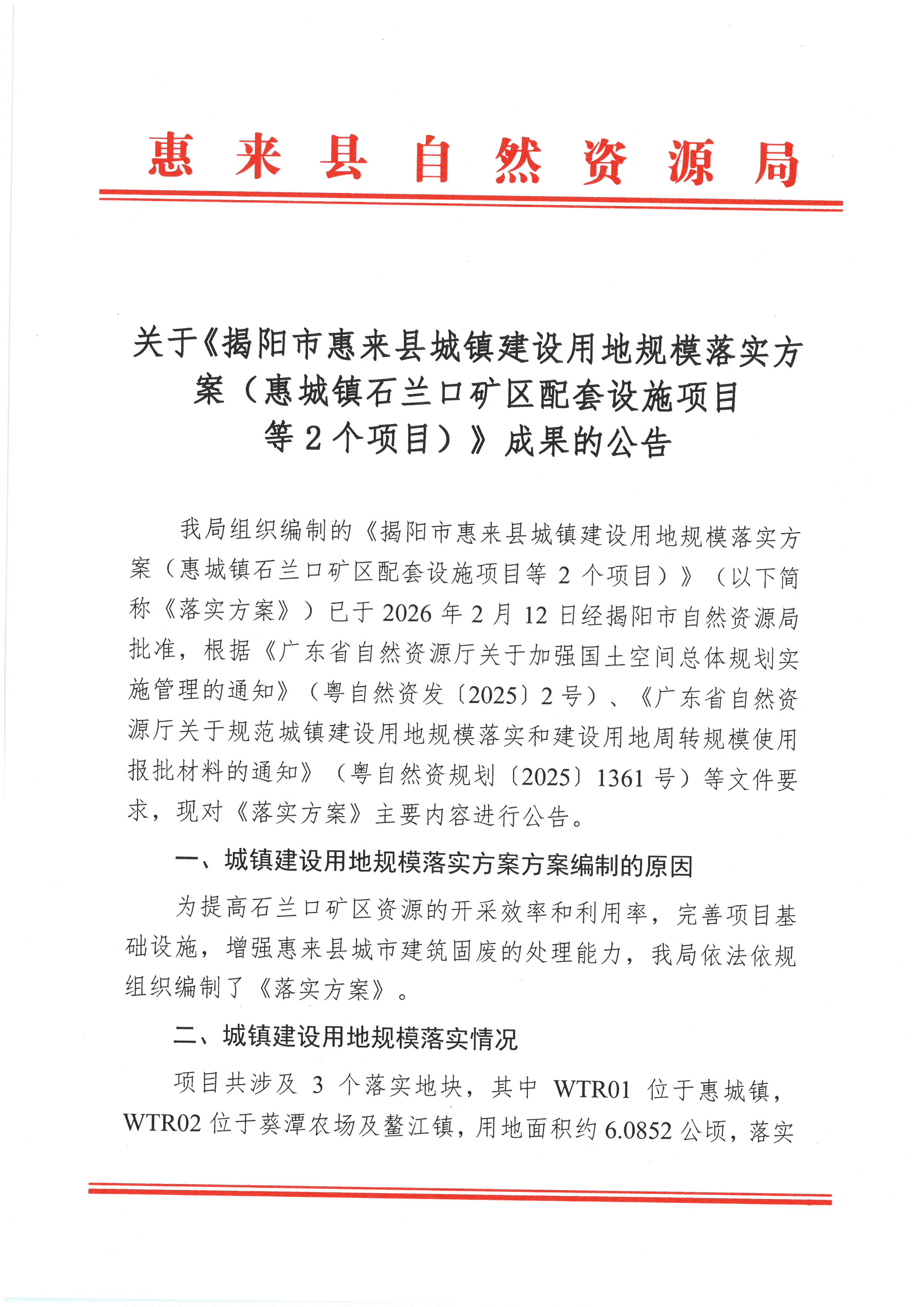 关于《揭阳市惠来县城镇建设用地规模落实方案(惠城镇石兰口矿区配套设施项目等2个项目)》成果的公告