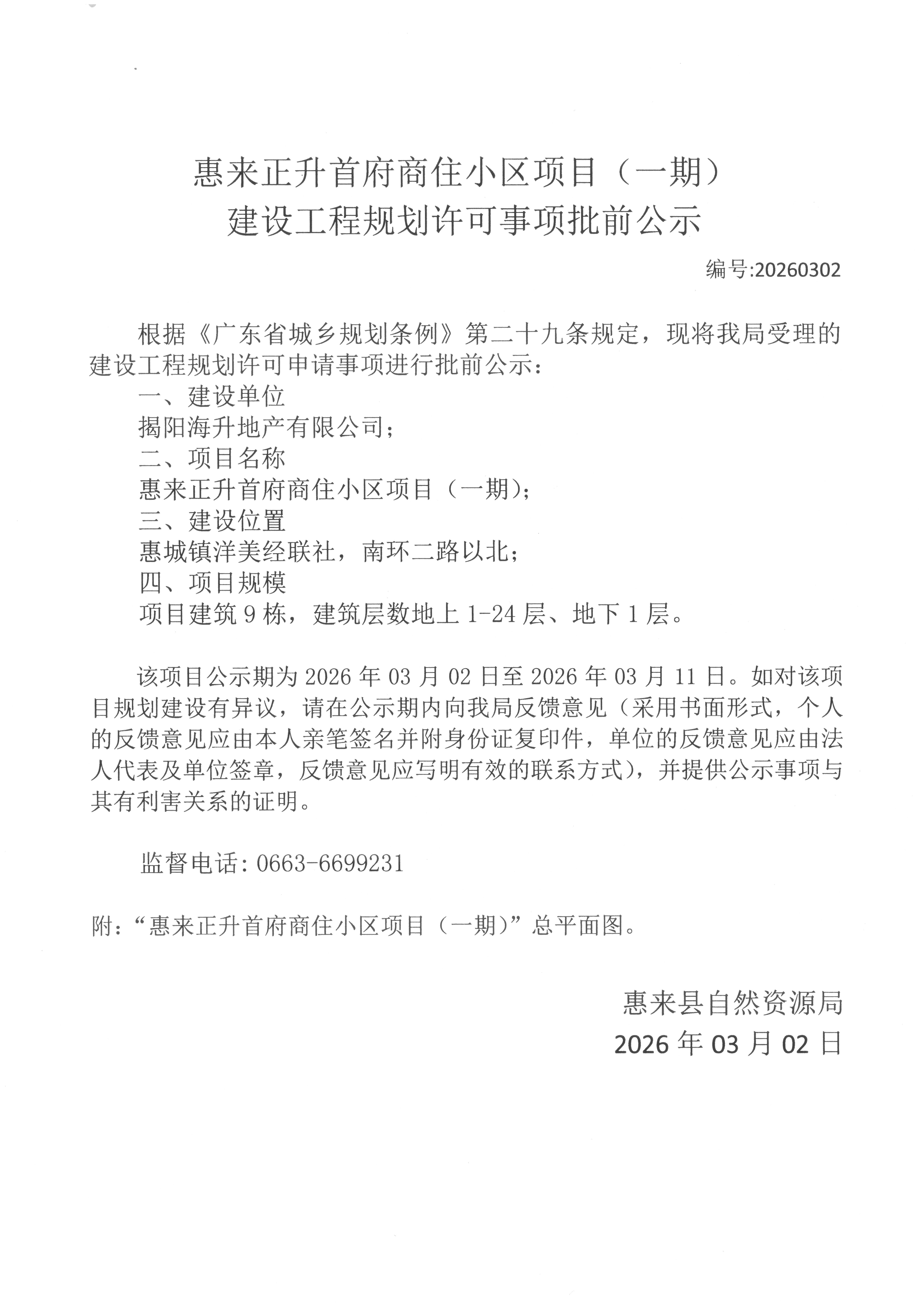 惠来正升首府商住小区项目(一期)建设工程规划许可证申请公示