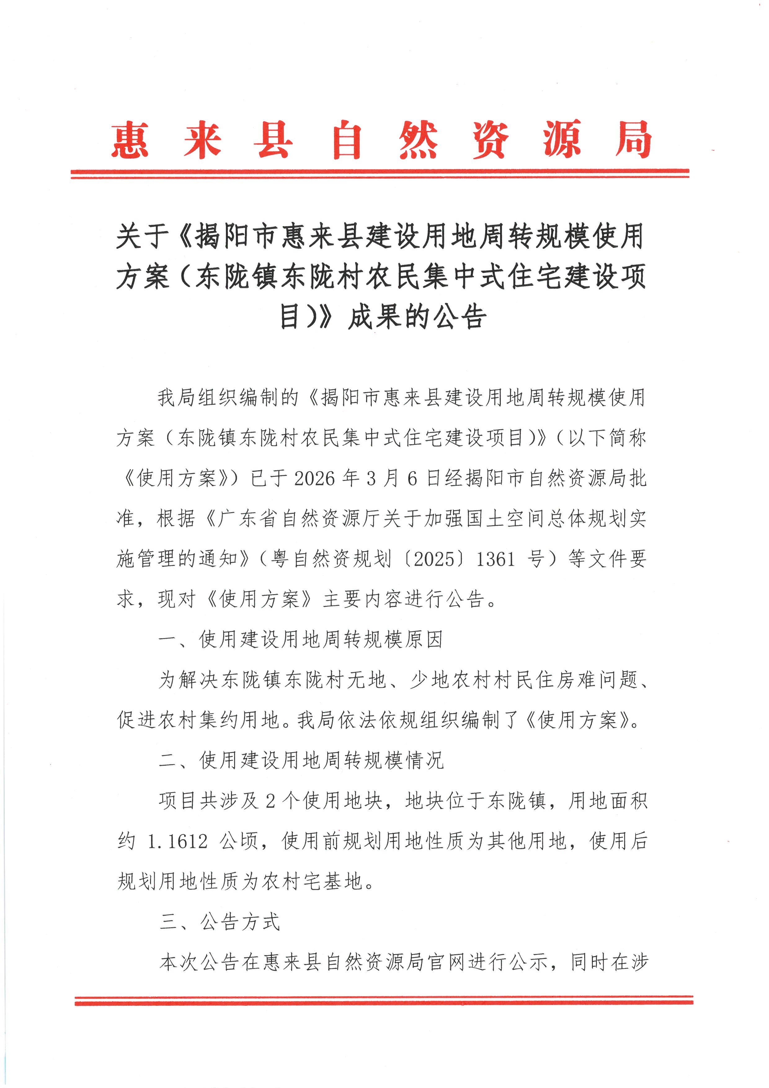 关于《揭阳市惠来县建设用地周转规模使用方案(东陇镇东陇村农民集中式住宅建设项目)》成果的公告