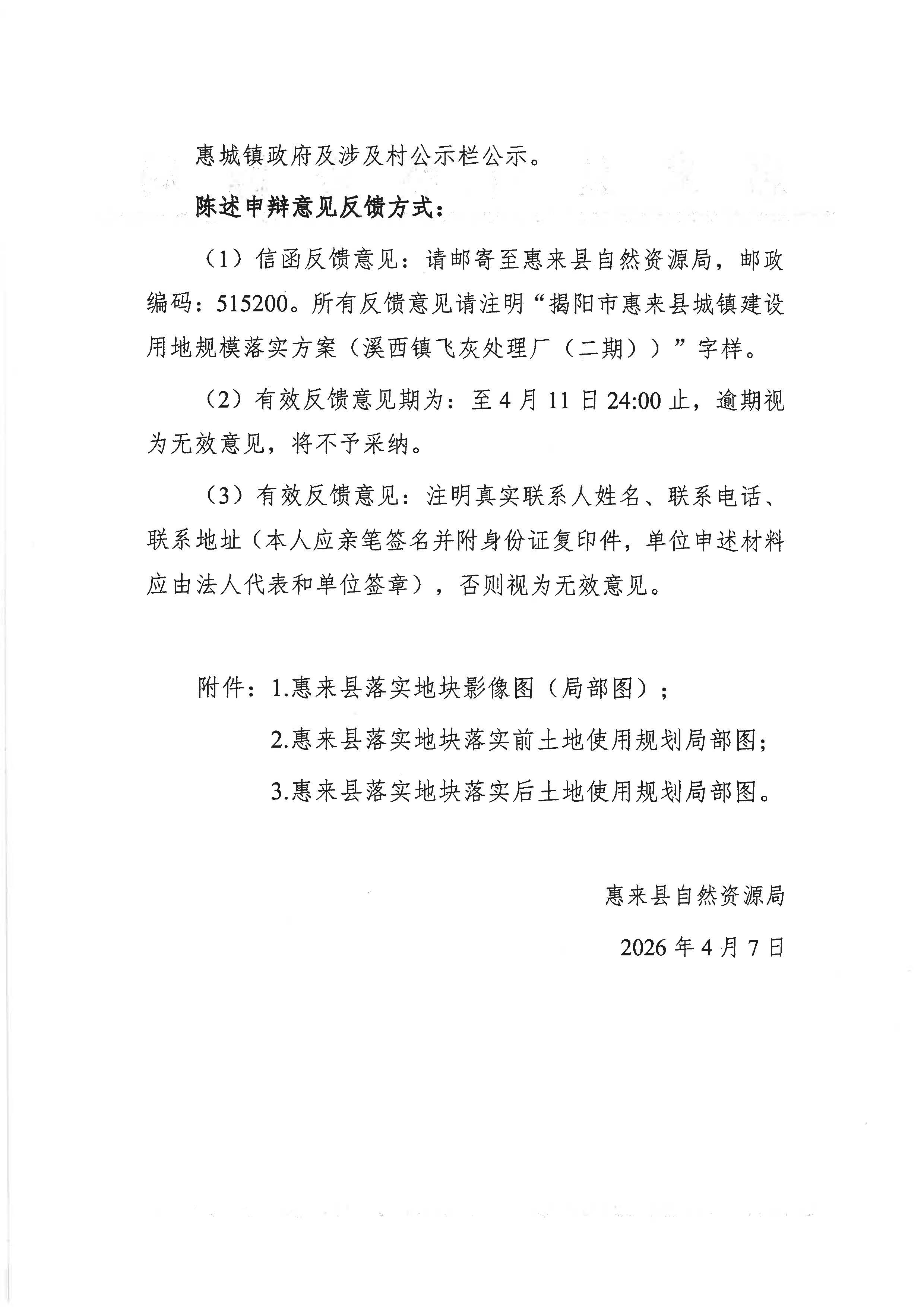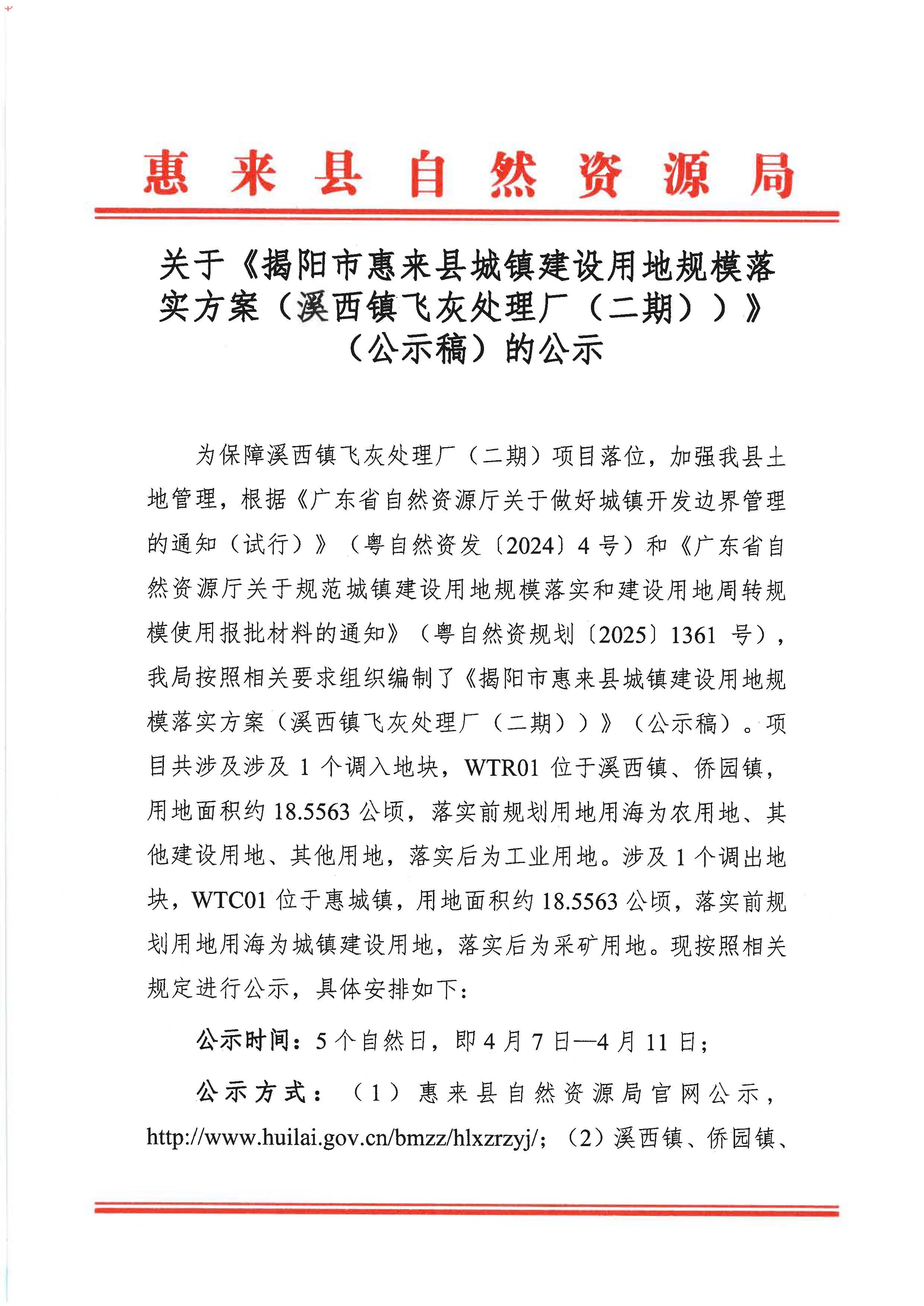 关于《揭阳市惠来县城镇建设用地规模落实方案(溪西镇飞灰处理厂(二期))》(公示稿)的公示