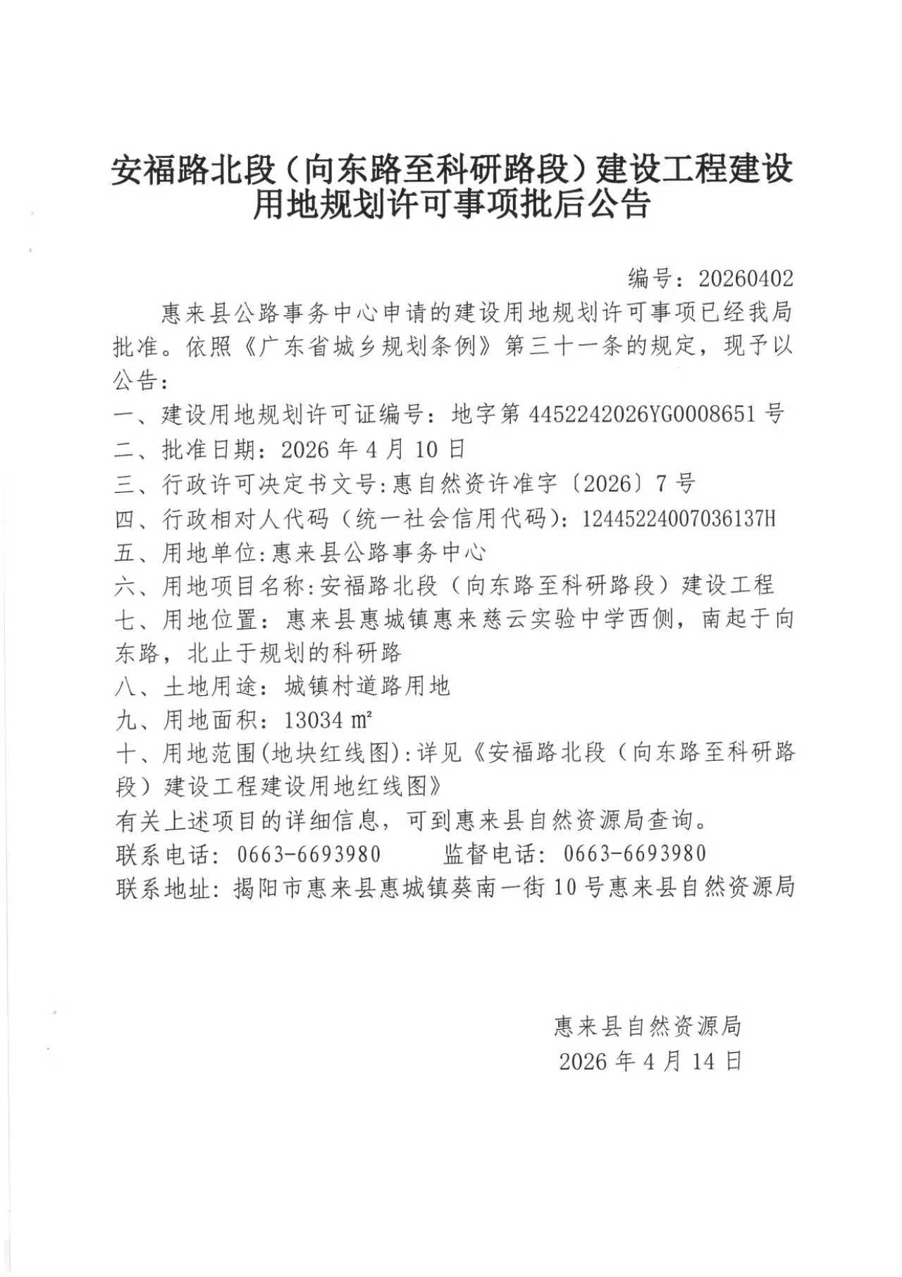 安福路北段(向东路至科研路段)建设工程建设用地规划许可事项批后公告
