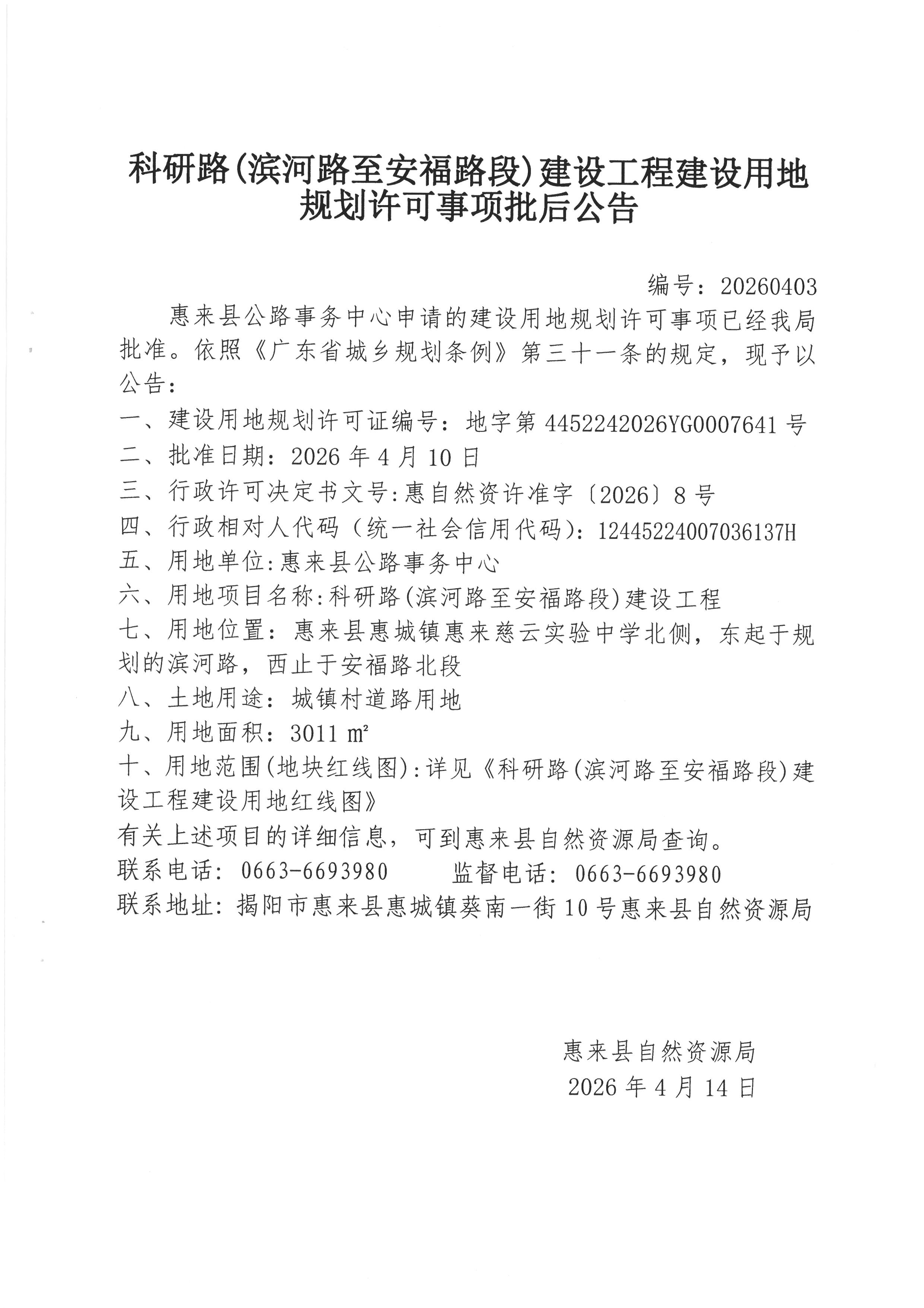 科研路(滨河路至安福路段)建设工程建设用地规划许可事项批后公告
