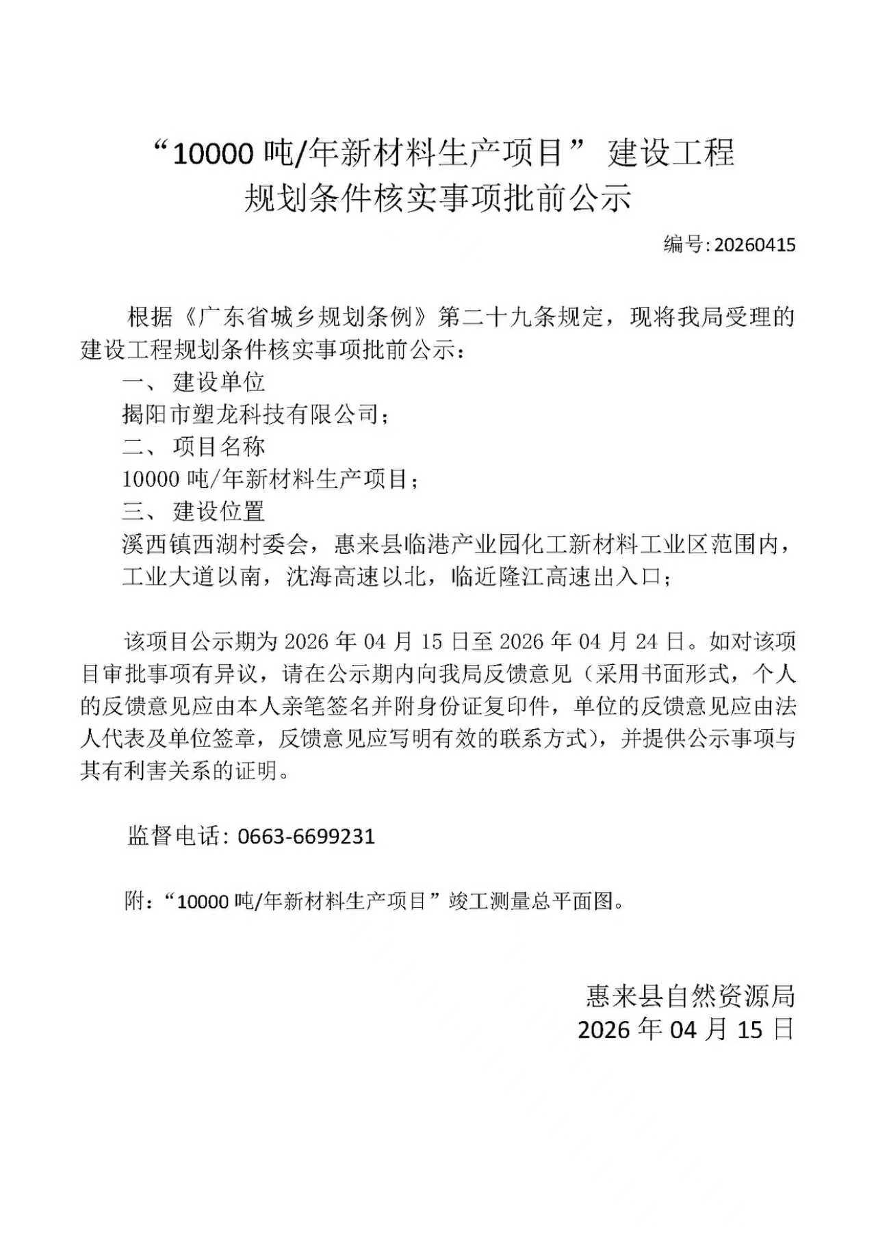 10000吨/年新材料生产项目建设工程规划条件核实批前公示