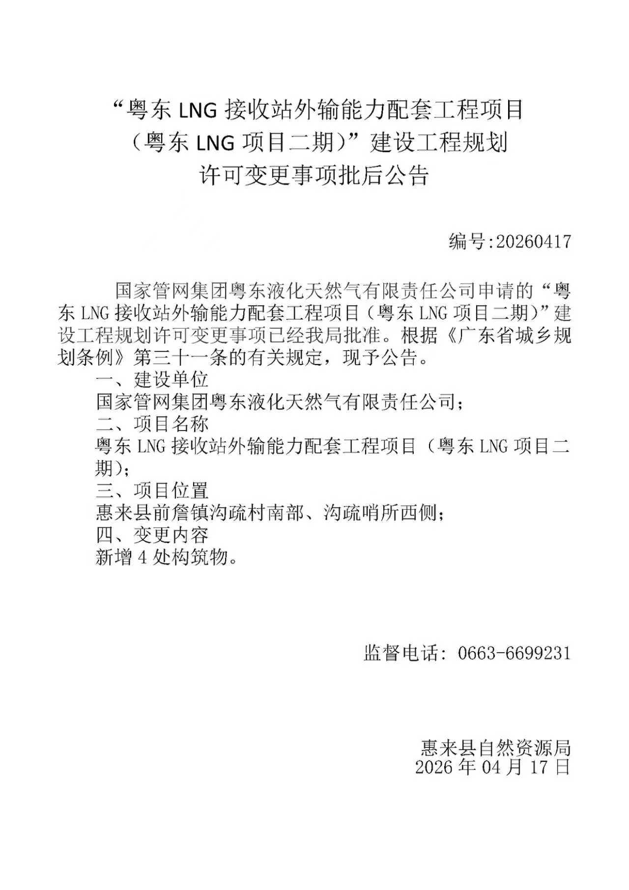 “粤东LNG接收站外输能力配套工程项目(粤东LNG项目二期)”建设工程规划许可变更事项批后公告