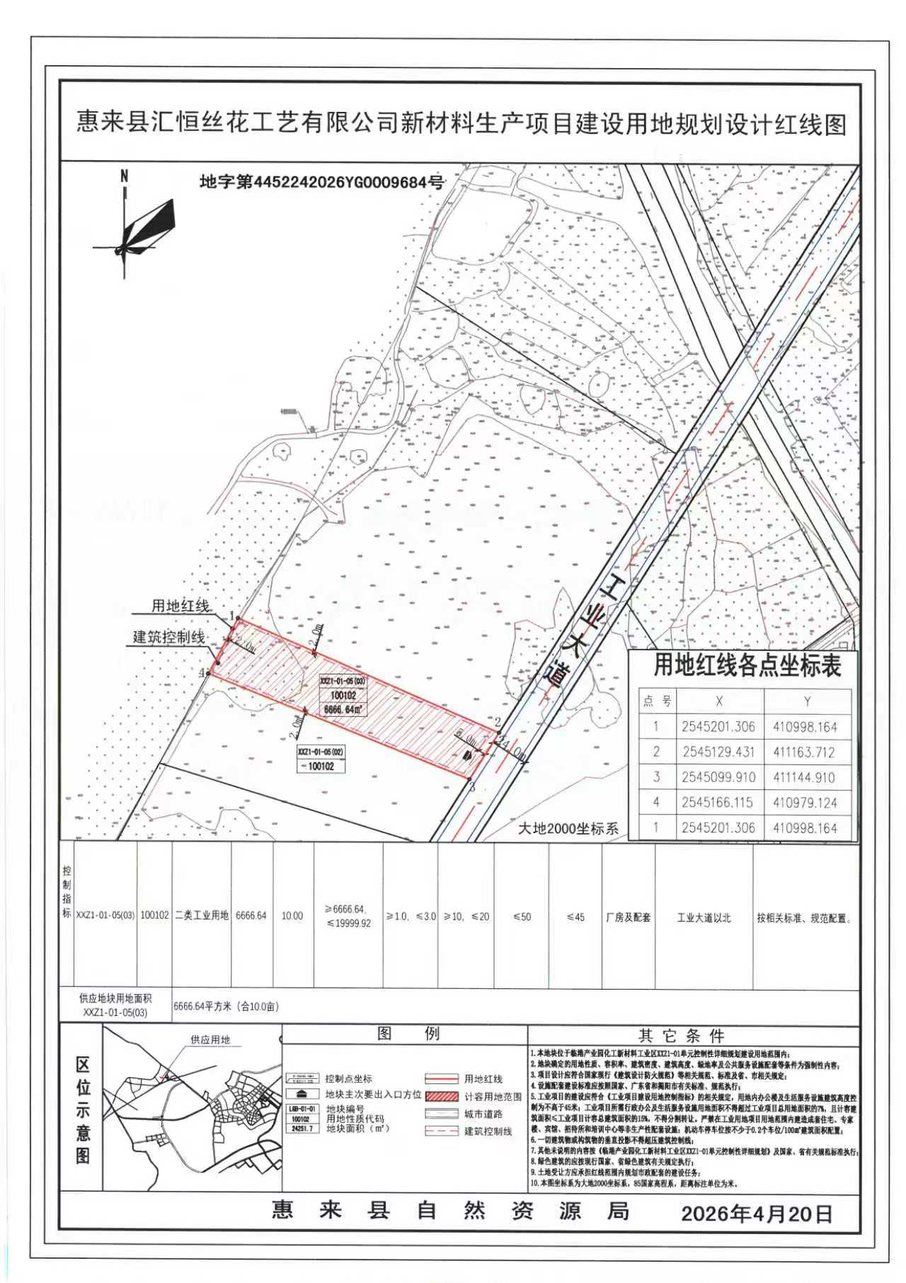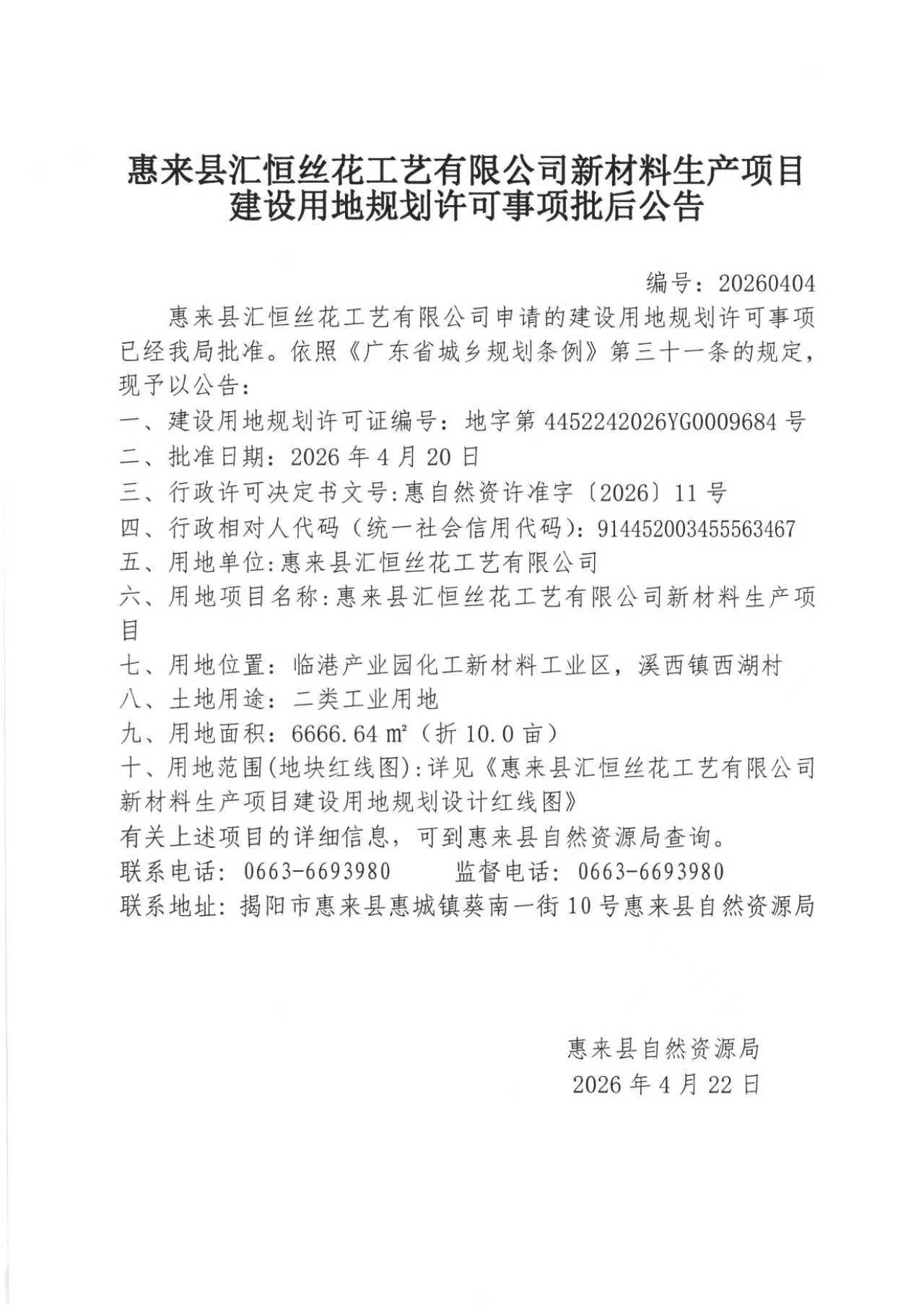 惠来县汇恒丝花工艺有限公司新材料生产项目建设用地规划许可事项批后公告