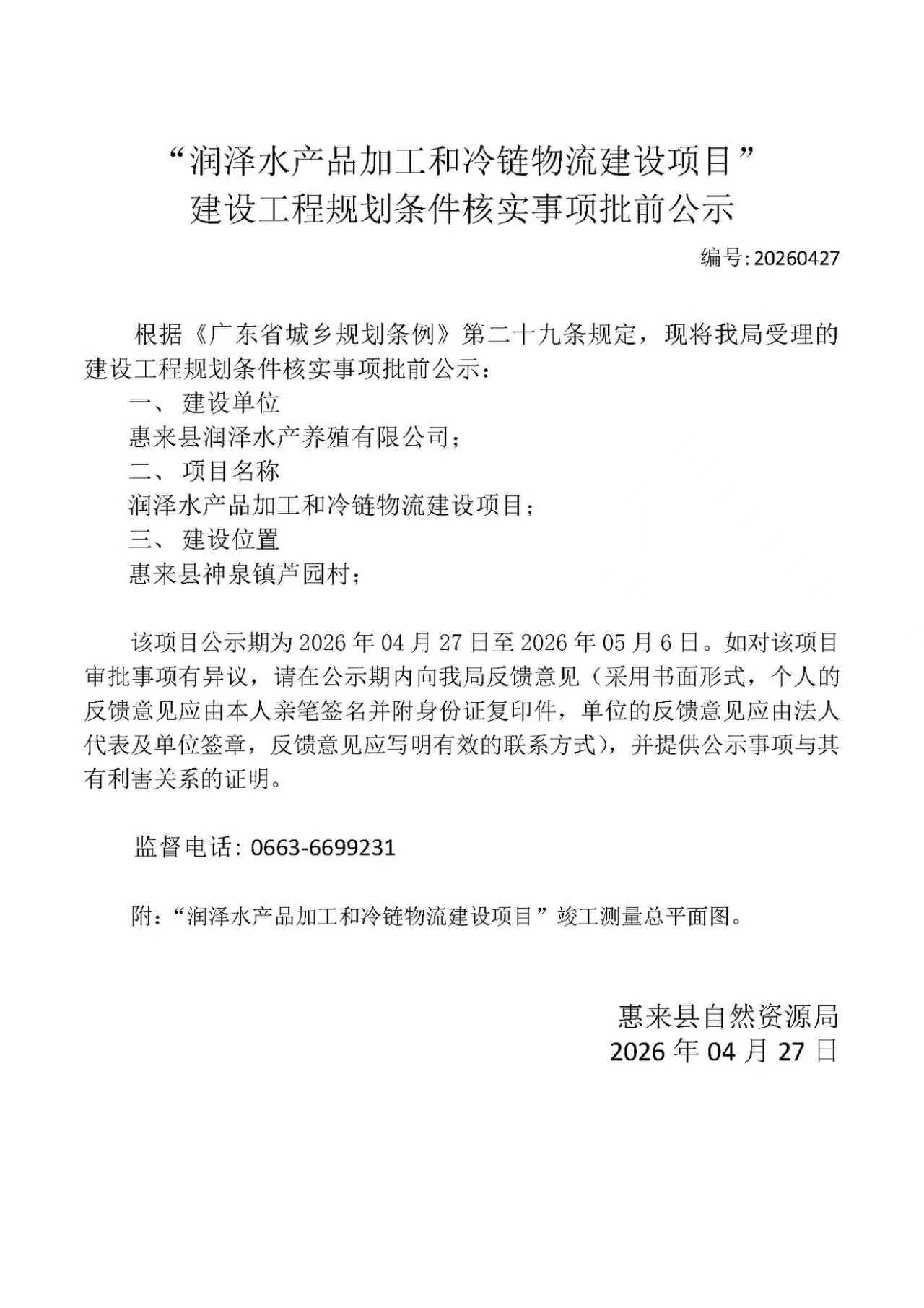 润泽水产品加工和冷链物流建设项目建设工程规划条件核实批前公示