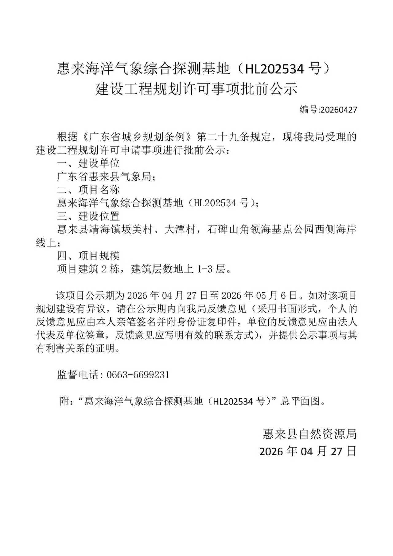 惠来海洋气象综合探测基地(HL202534号)建设工程规划许可证申请公示