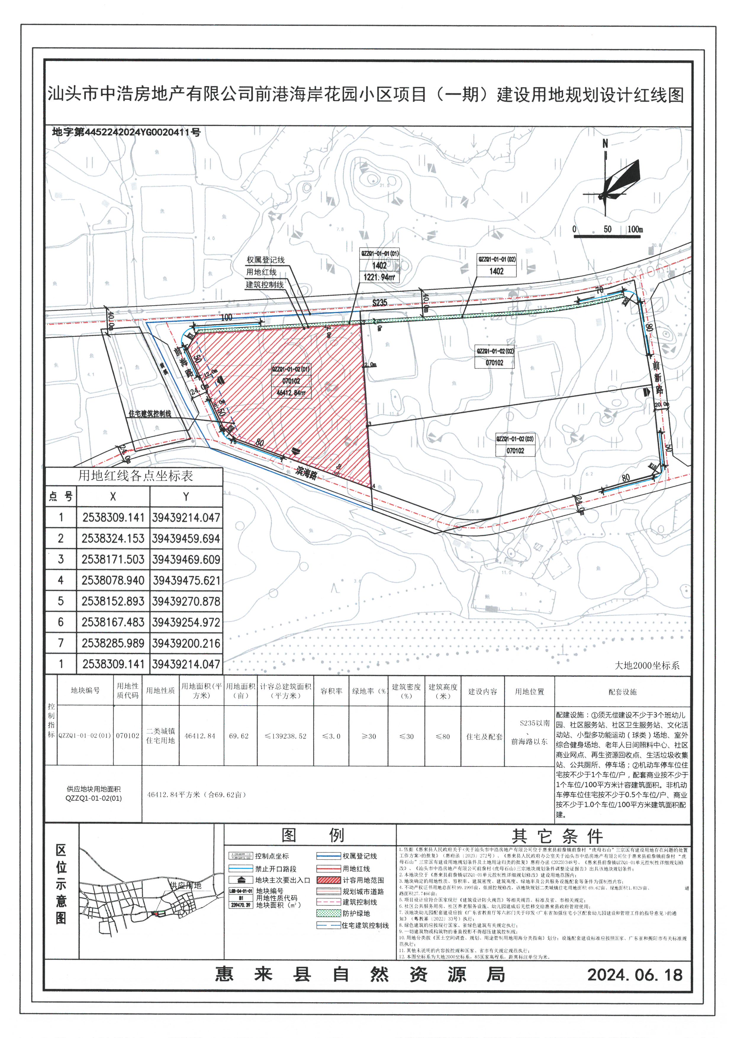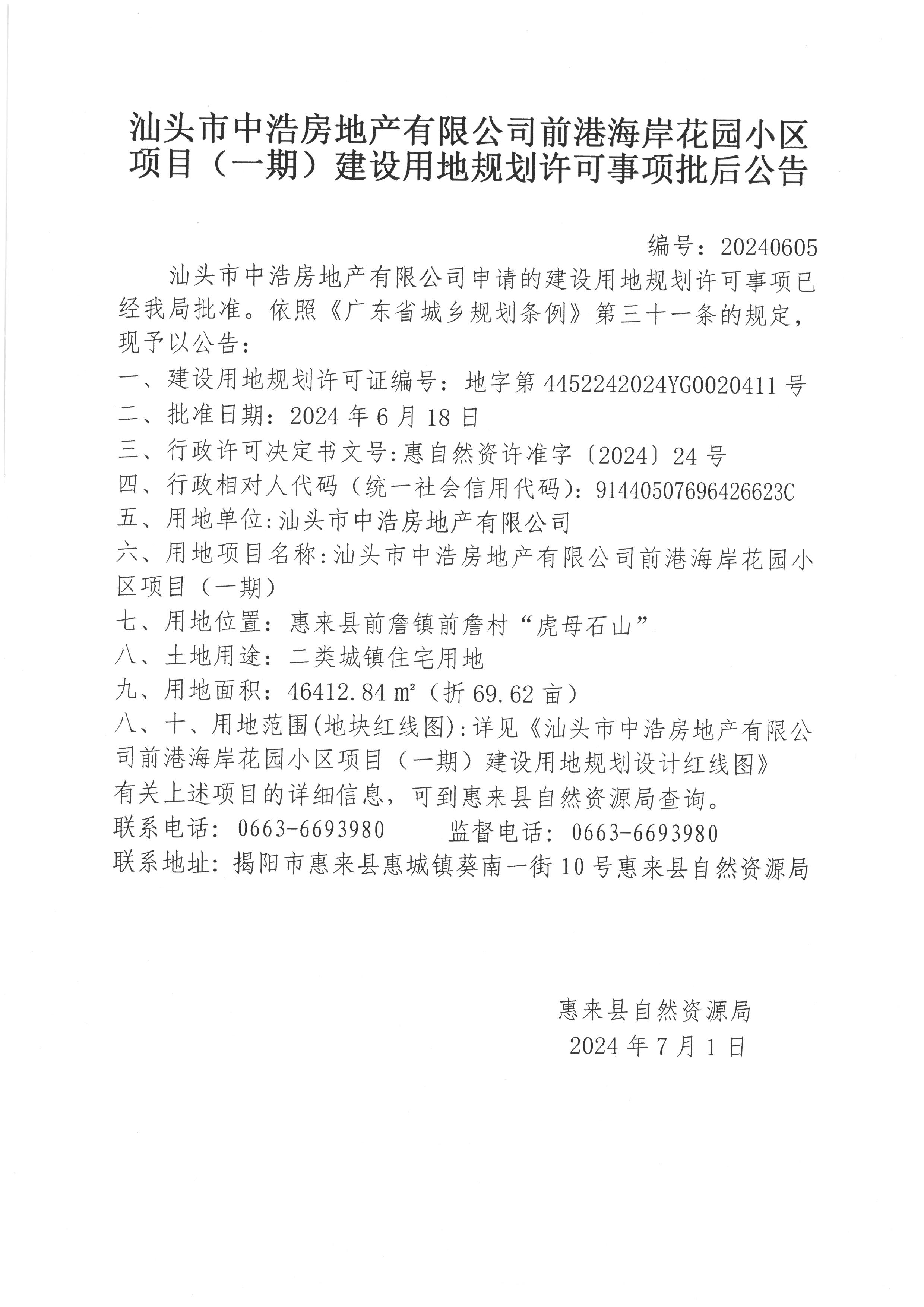 汕头市中浩房地产有限公司前港海岸花园小区项目(一期)建设用地规划许可事项批后公告