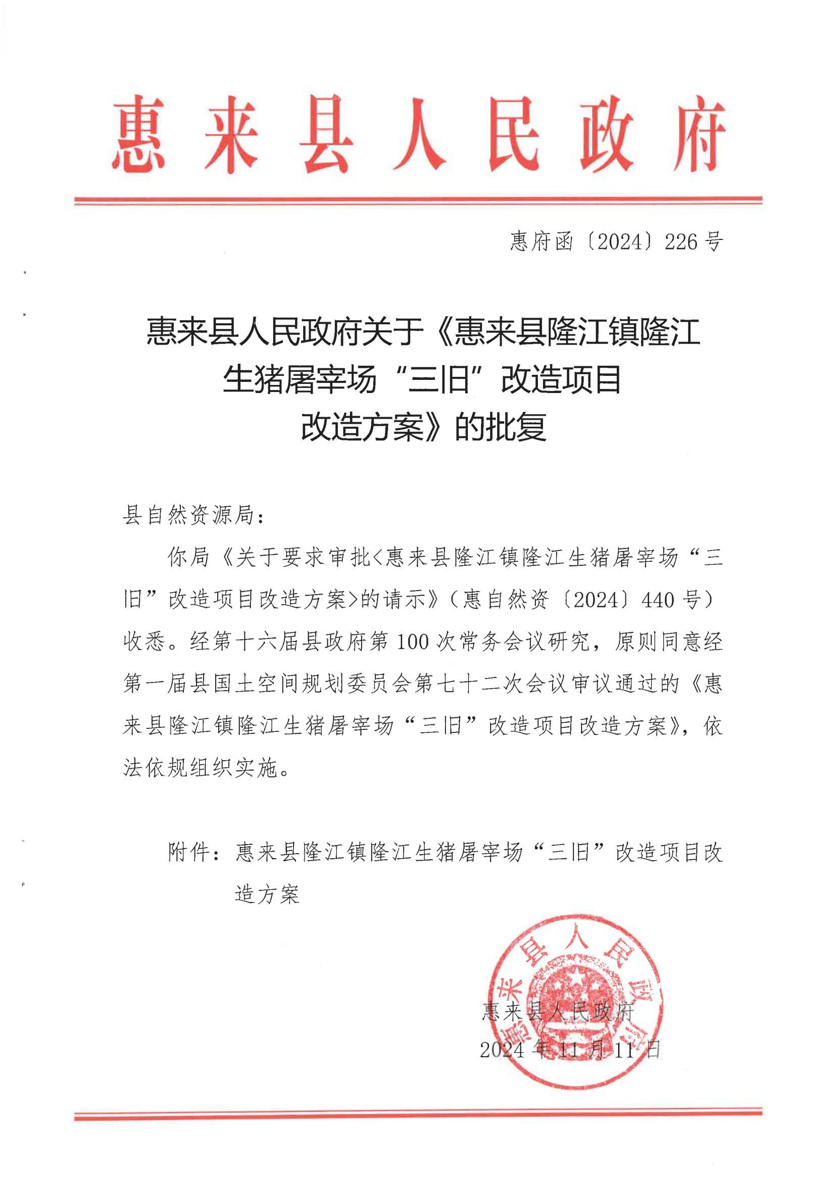 惠来县人民政府关于《惠来县隆江镇隆江生猪屠宰场“三旧”改造项目改造方案》的批复(惠府函【2024】226号).pdf