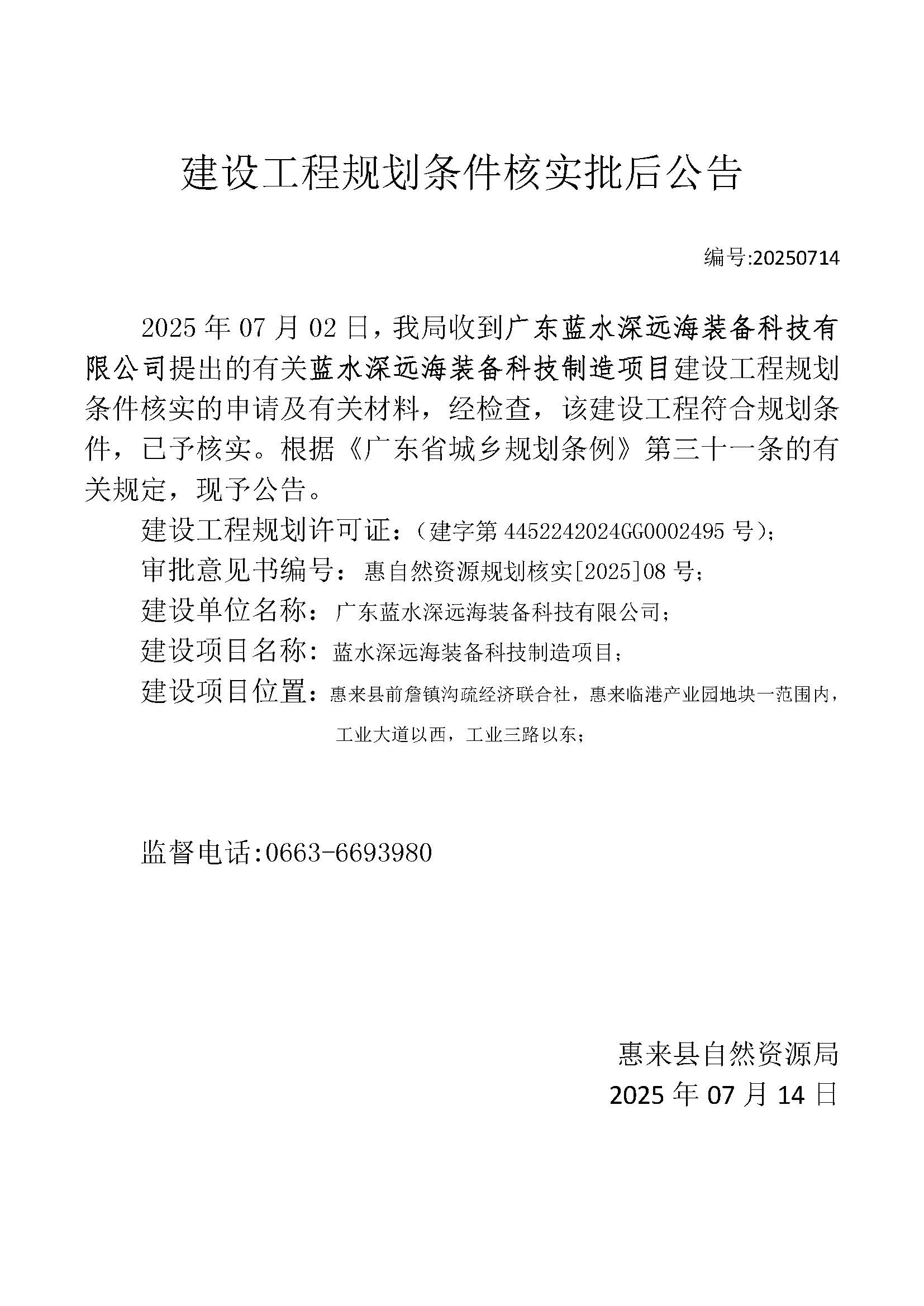 蓝水深远海装备科技制造项目建设工程规划条件核实批后公告
