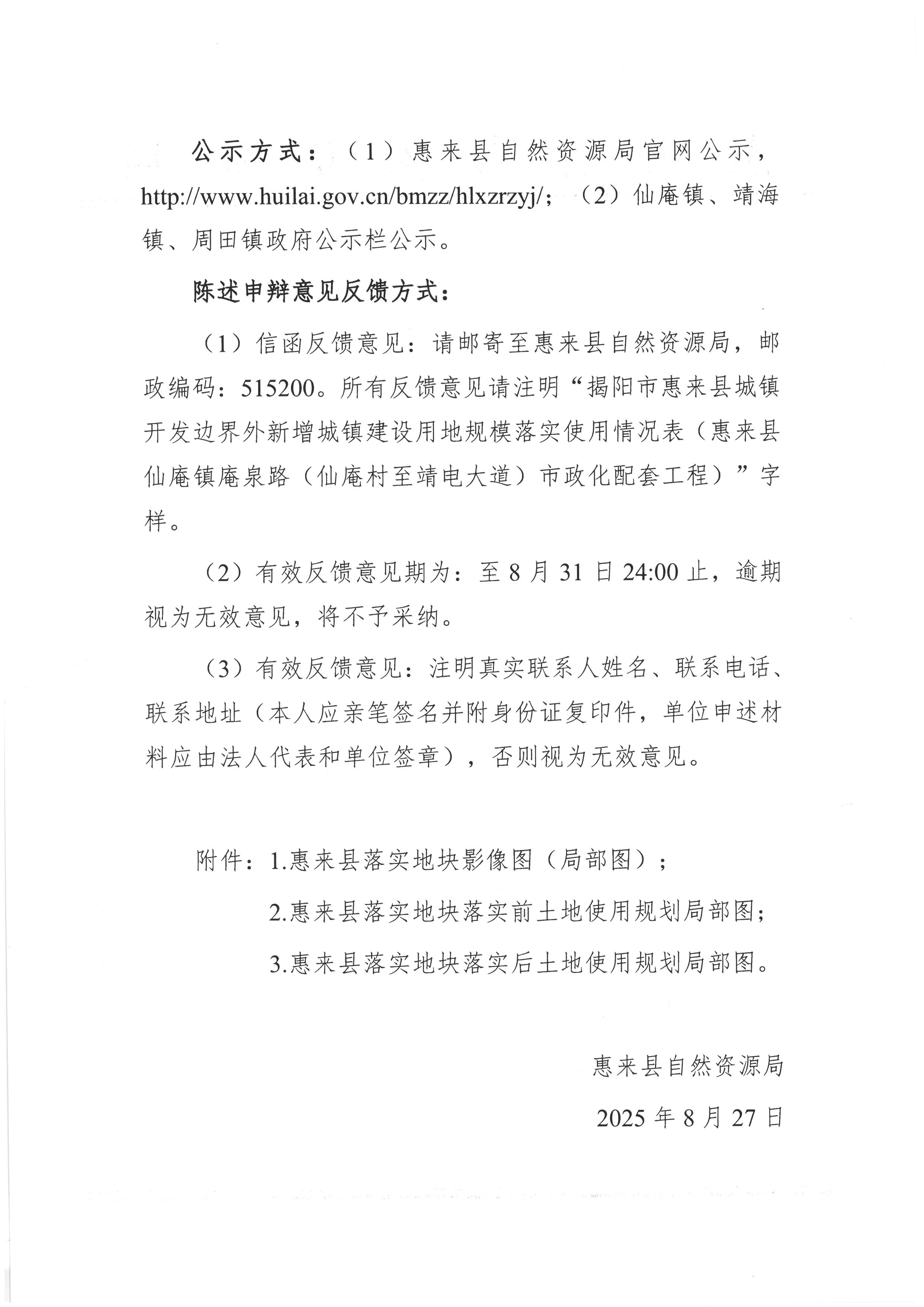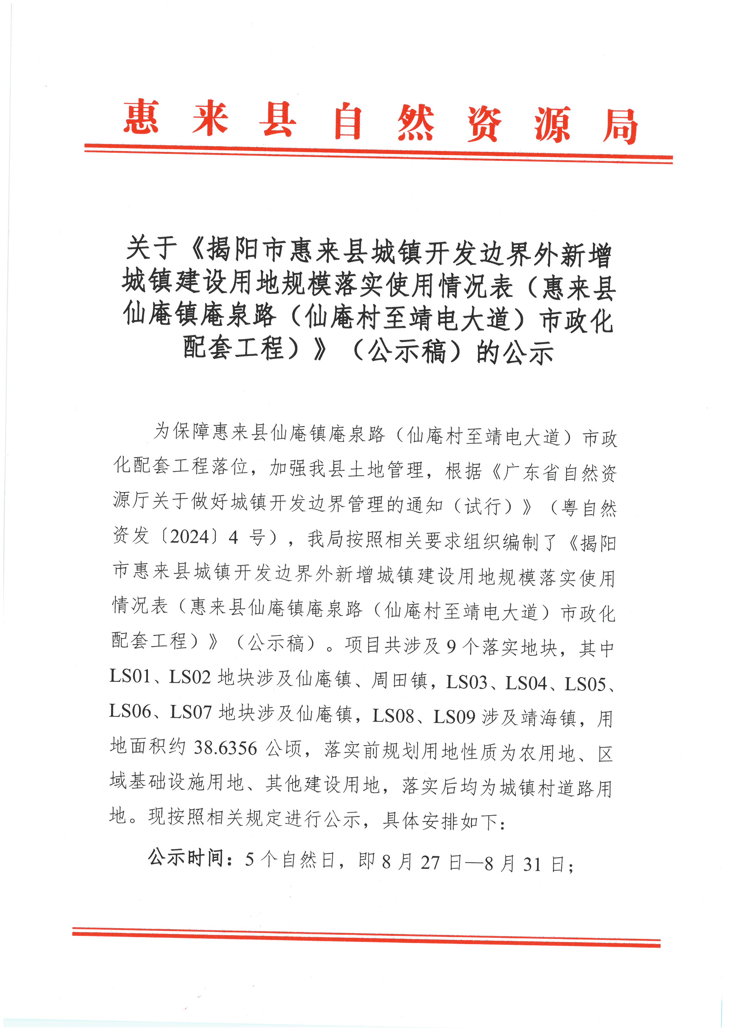 关于《揭阳市惠来县城镇开发边界外新增城镇建设用地规模落实使用情况表(惠来县仙庵镇庵泉路(仙庵村至靖电大道)市政化配套工程)》(公示稿)的说明