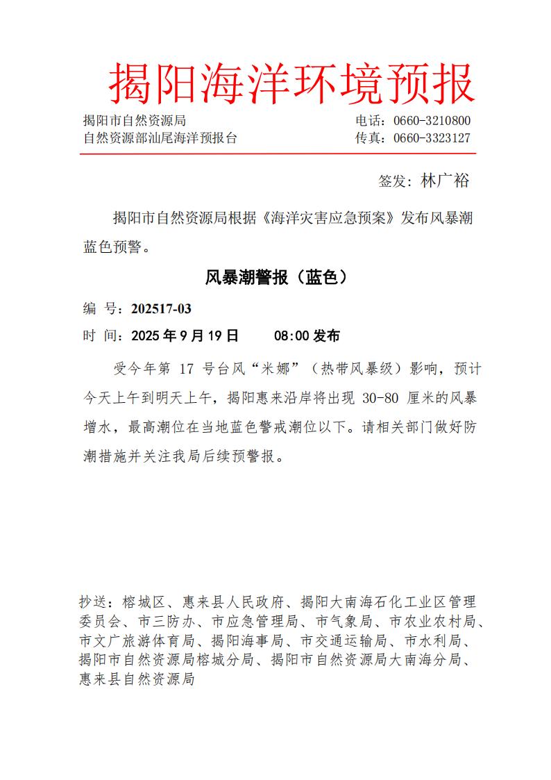 风暴潮警报(蓝色) 2025年9月19日 8:00