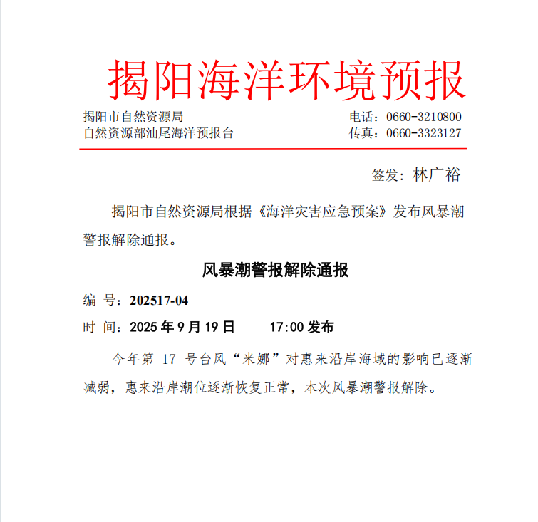 风暴潮警报解除 2025年9月19日 17:00