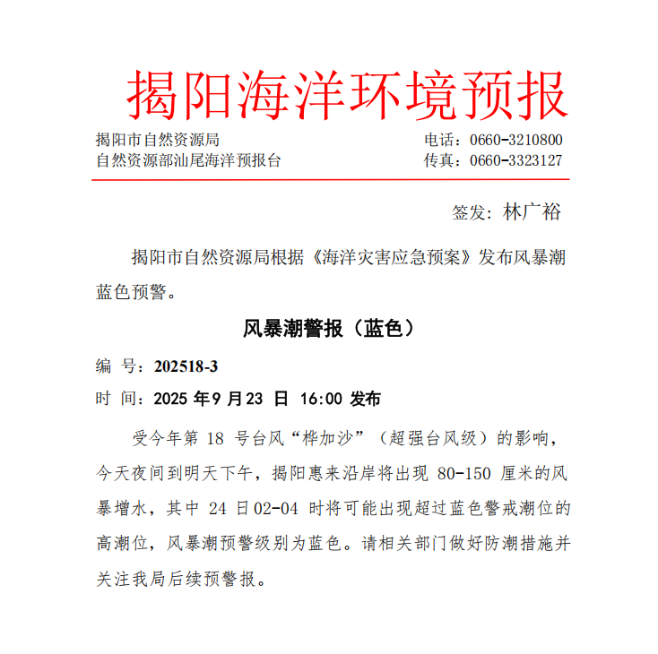 风暴潮警报(蓝色) 2025年9月23日 16:00