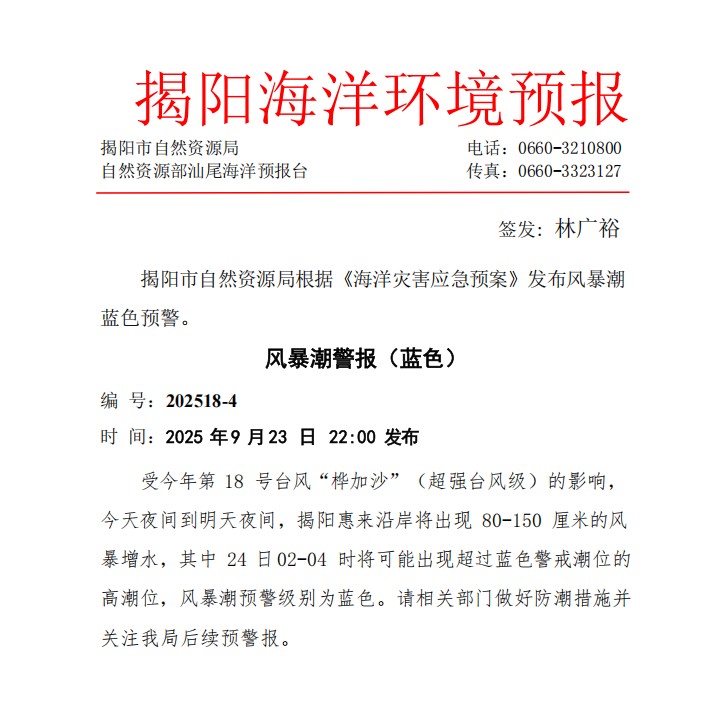 风暴潮警报(蓝色) 2025年9月23日 22:00