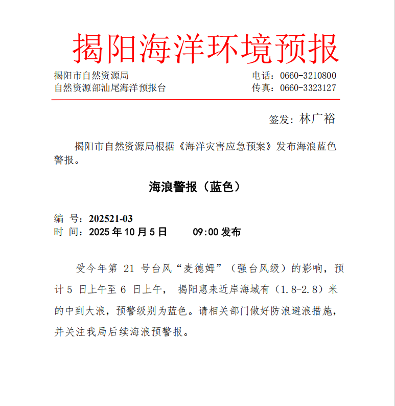 海浪警报(蓝色) 2025年10月5日 9:00